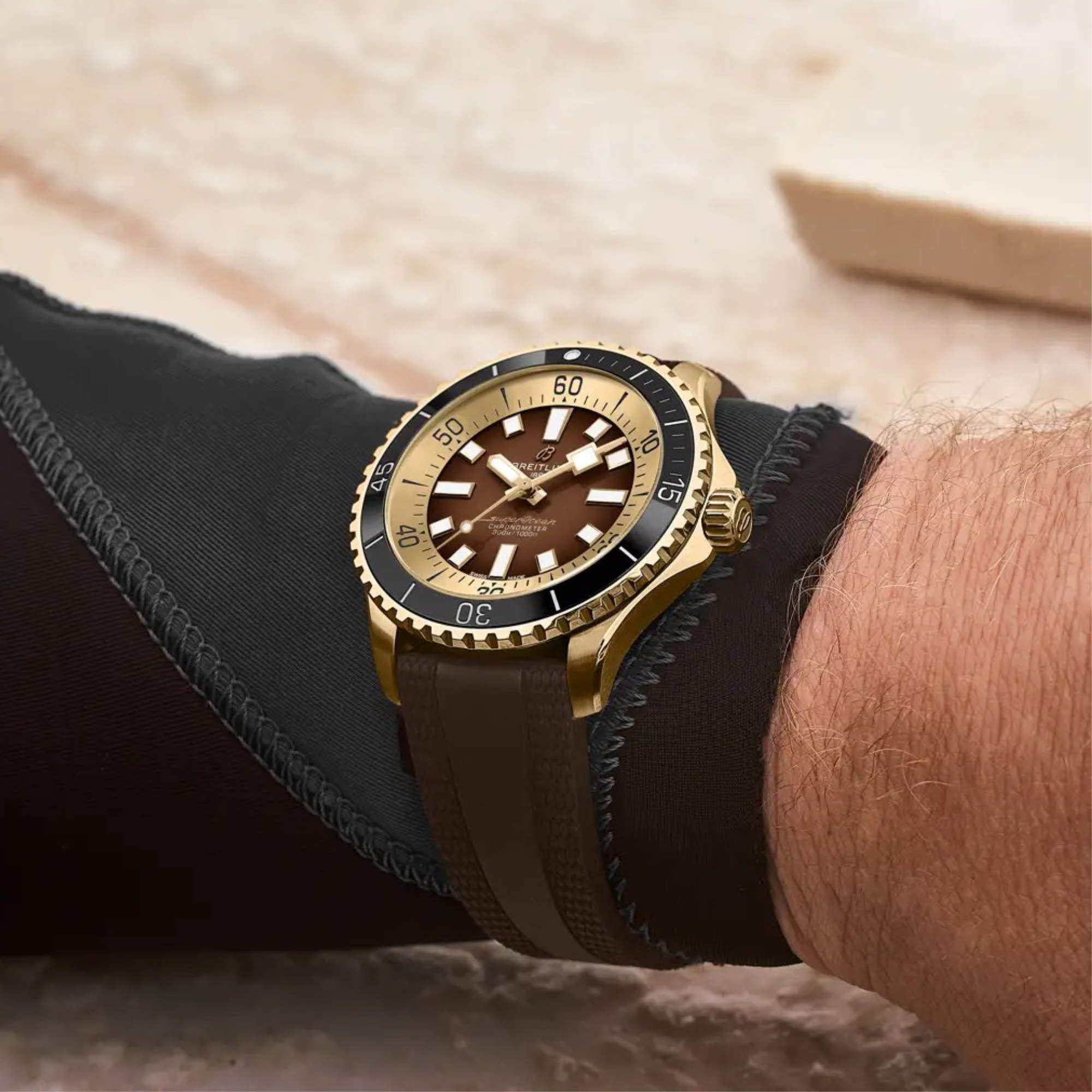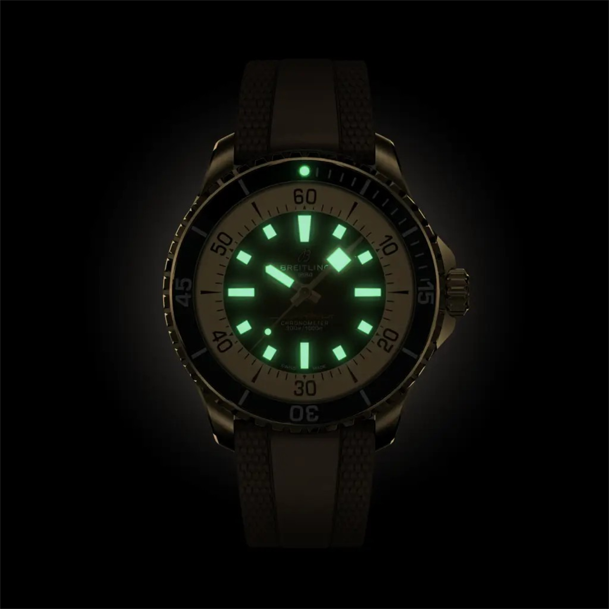 Ref. N17376201Q1S1 - Die neue Superocean sieht nicht nur gut aus, sondern ist auch ein technisches Meisterwerk. Sie ist bis 300 m (1000 ft) wasserdicht und verfügt über breite Zeiger und Indizes, die mit Super-LumiNova® beschichtet sind und eine außergewöhnlich gute Ablesbarkeit unter Wasser ermöglichen. Ihre kratzfeste Lünette mit Keramikeinlage verschleißt nicht und bleicht nicht aus. Aus Sicherheitsgründen ist die Lünette bei den meisten Größen nur einseitig drehbar; die bidirektionale Lünette der 46-mm-Uhr ist durch eine patentierte Arretierung gesichert. Darüber hinaus ist diese Uhr stoßfest sowie sand- und salzwasserbeständig. Für das automatische Breitling-Kaliber 17 gilt eine 2-jährige Garantie und das Uhr werk bietet ca. 38 Stunden Gangreserve.Ihr Ansprechpartner