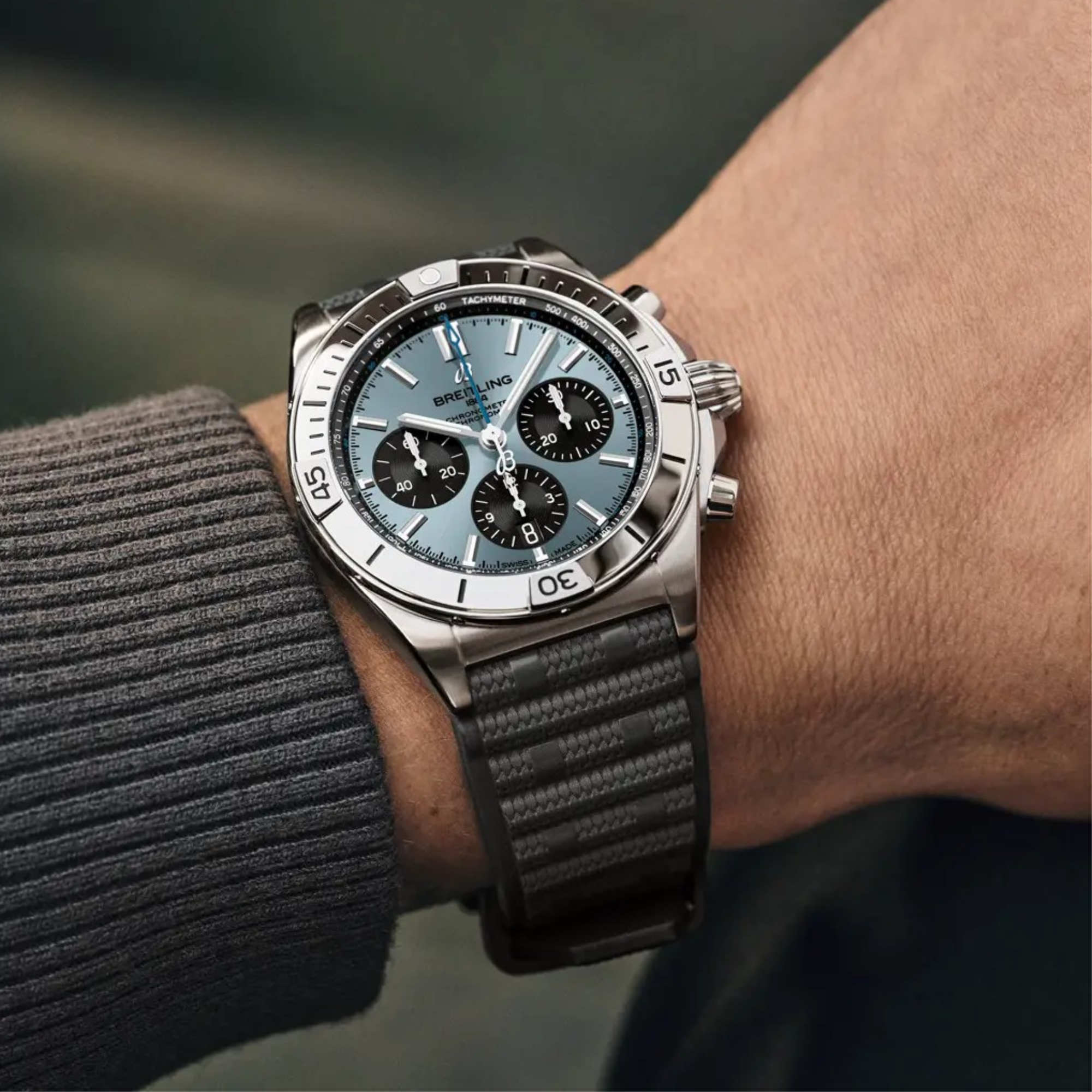 Das Modell verfügt über ein 42-mm-Gehäuse und die legendäre Lünette mit den vier Reitern. Die Chronomat ist mit verschiedenen farbenfrohen Zifferblättern lieferbar und auf das charakteristische Rouleaux-Armband aus Metall oder Kautschuk abgestimmt. Angetrieben wird das Modell vom Breitling-Manufakturkaliber 01, einem COSC-zertifizierten Chronometer.