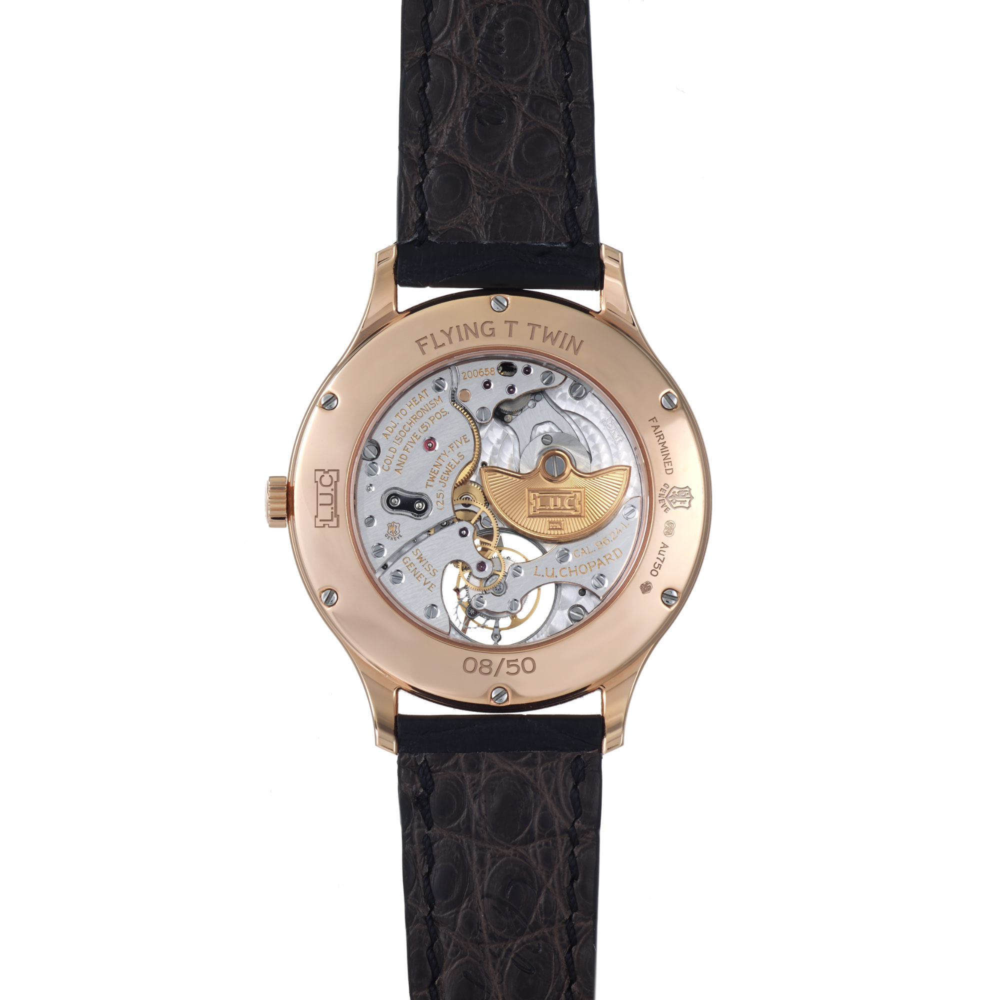 Ref. 161978-5001 - Mit dem neuen Zeitmesser L.U.C Flying T Twin weiht Chopard sein erstes Kaliber mit fliegendem Tourbillon ein. Technisch wie ästhetisch ein Leckerbissen, hebt sich diese Uhr durch ihren einzigartigen Stil ab: ein handguillochiertes Goldzifferblatt, harmonische Proportionen und ein extraschlankes Gehäuse aus ethischem Roségold mit Fairmined-Zertifikat machen aus dieser Uhr einen Star im Kreis der Kollektion L.U.C. Diese mit extremer Raffinesse ausgestattete limitierte Serie von 50 Exemplaren, die für den modernen Gentleman und Connaisseur der feinen Uhrmacherei entworfen wurde, ist mit dem Genfer Siegel ausgezeichnet.Ihr Ansprechpartner