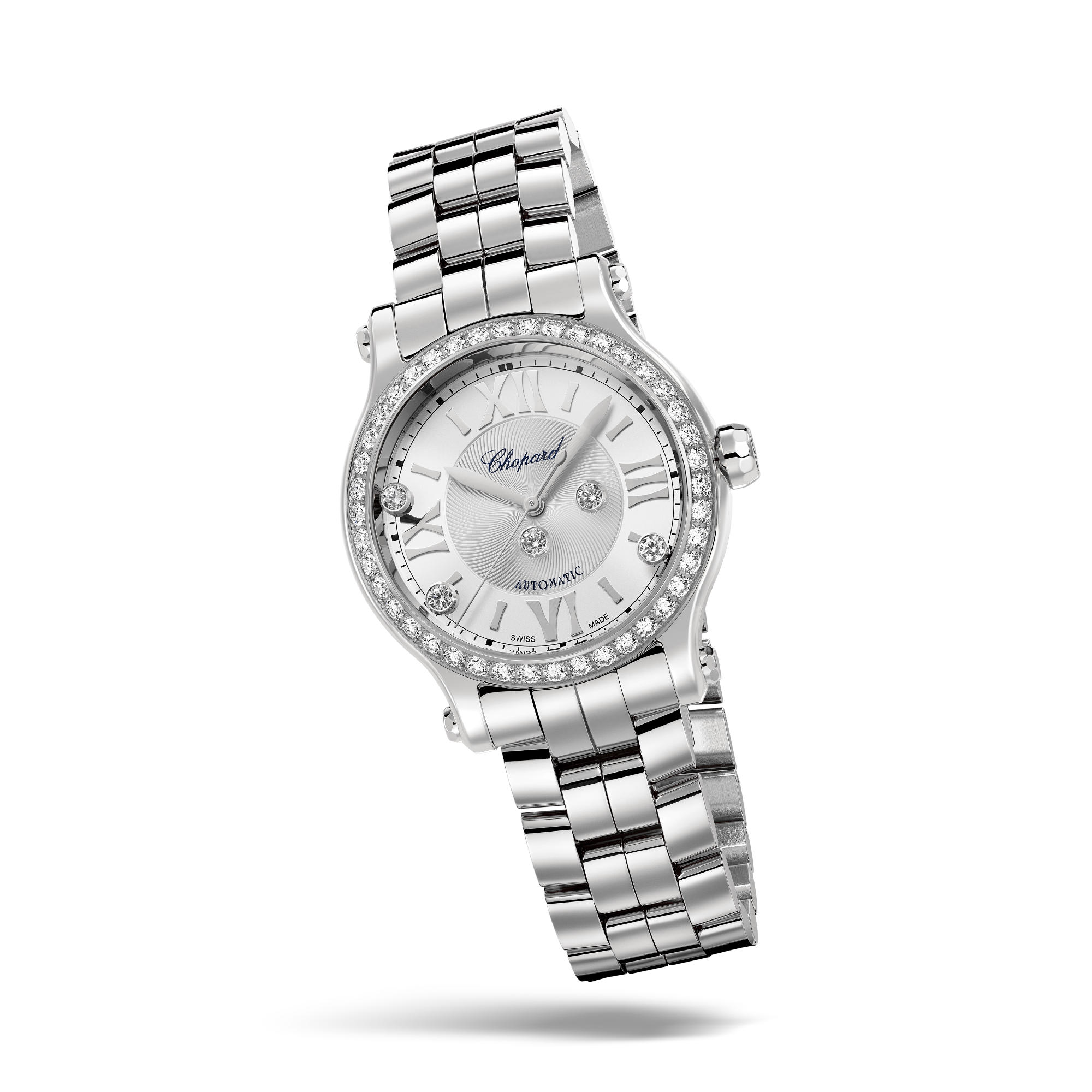 Ref. 278608-3004 - Die Happy Sport-Kollektion ist das Sinnbild für die Kreativität und Stärke von Chopard. Ihre verspielten, frei wirbelnden Diamanten tanzen zwischen zwei Saphirgläsern und fangen seit 1993 die Vorstellungskraft ein, als Chopard das das erste Unternehmen war, das Edelstahl und Diamanten kombinierte. Dank seiner Uhrmacherkompetenz konnte Chopard die Happy Sport 33 mm mit einem mechanischen Uhrwerk mit Automatikaufzug ausstatten, das speziell für Gehäuse von Damenuhren entwickelt wurde. Little Diamonds Do Great ThingsIhr Ansprechpartner