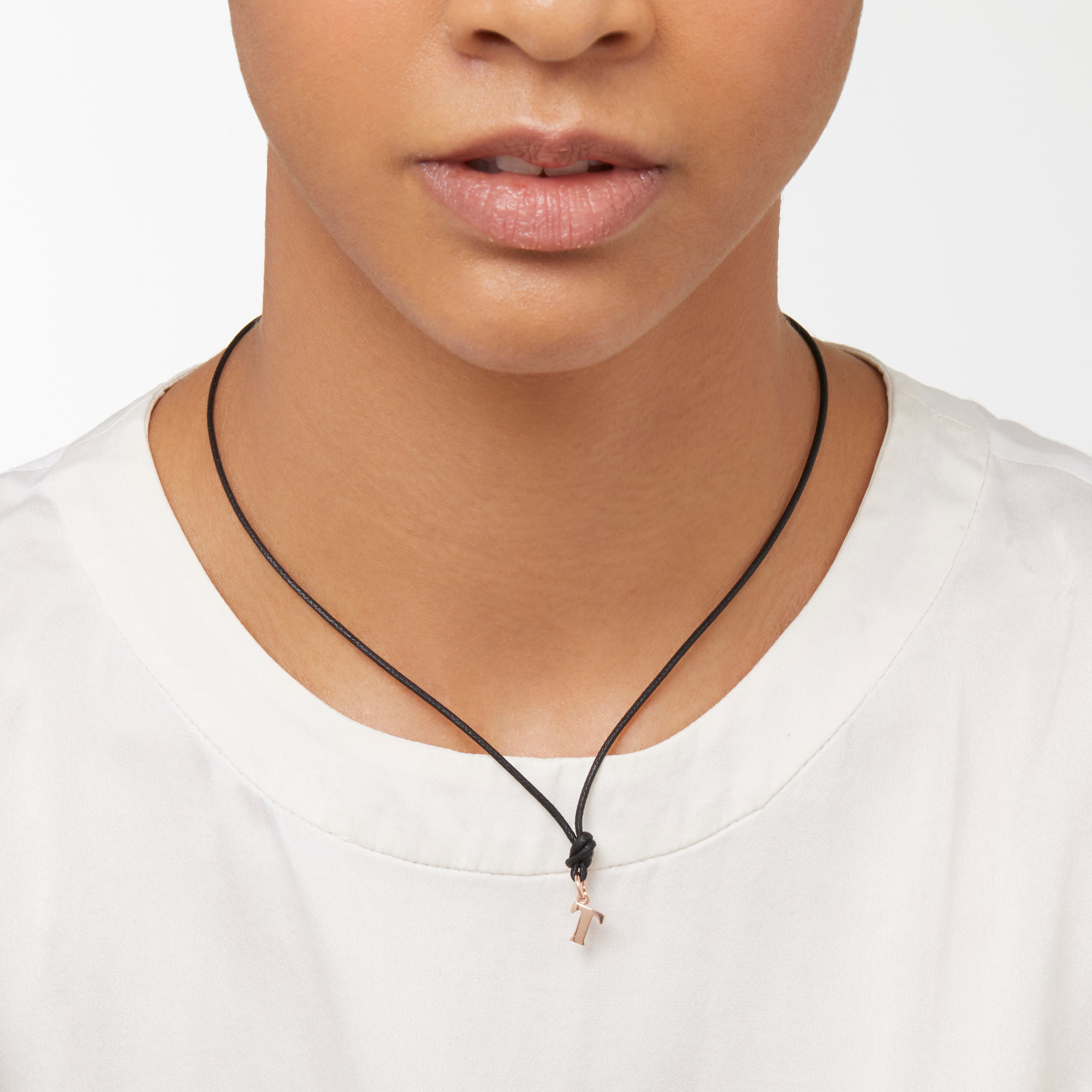Ref. DMB2023-LETTL-0009R - T... MEIN TRAUMTYP! - Aus 9-karätigem Roségold, Höhe 0,9 cm. Schwarze Kordel inklusive.Ihr Ansprechpartner