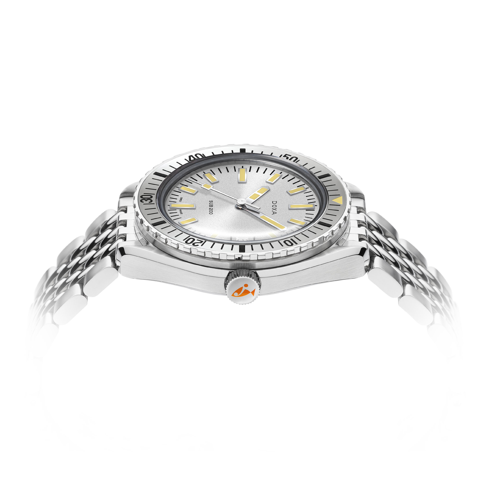 Ref. 796.10.021.10 - Diese auf der Baselworld 2019 eingeführten 3-Zeiger-Taucheruhr hat ein Gehäuse aus hochwertigem 316L-Edelstahl mit einem Durchmesser von 42 mm. Das kratzfeste, entspiegelte Saphirglas der SUB 200 besticht durch die markante Wölbung des damals verwendeten Plexiglas. Das Modell ist bis zu einer Tiefe von 200 Metern (20 bar) wasserdicht und verfügt über eine einseitig drehbare Lünette. Sämtliche Elemente, die Tauchinformationen liefern, einschließlich auf der Lünette, sind mit einer Super-LumiNova®-Leuchtbeschichtung versehen. Das Armband aus 316-L-Edelstahl weist auf der Faltschliesse das DOXA-Fischsymbol auf.