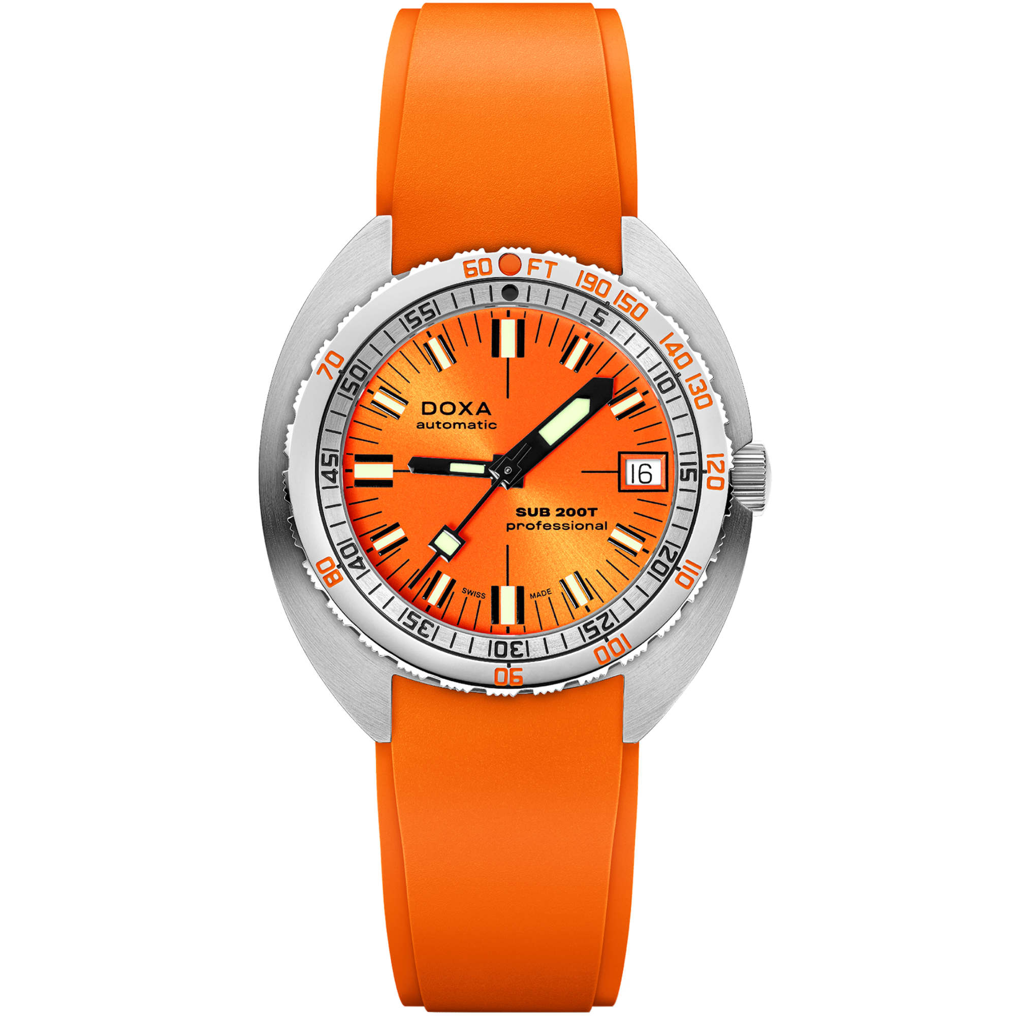 Ref. 804.10.351S.21 - Die neue SUB 200T wirkt mit ihrem kleinen Durchmesser stilistisch moderner und raffinierter, übernimmt aber geschickt die DNA des Originals. Durch die Überarbeitung der Volumina innerhalb des Gehäuses wurde die Reduzierung auf einen eleganten 39-mm-Durchmesser sowie eine angenehmere Höhe von 10,70 mm möglich. Darüber hinaus hat DOXA das Zifferblattdesign optimiert, um eine zeitgemäßere Optik am Handgelenk zu erzielen.