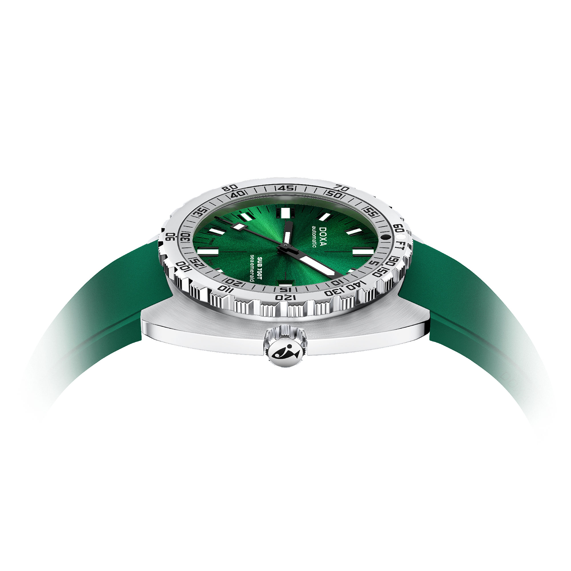 Heute bringt DOXA diese Ikone mit einem vollständig überarbeiteten Design in die Gegenwart. Die neue SUB 750T bewahrt die DNA des Originals mit ihrer markanten Präsenz, kompromisslosen Verarbeitung und robusten Zuverlässigkeit, präsentiert sich jedoch mit einer schlankeren und moderneren Silhouette. Das neu gestaltete Gehäuse bleibt mit 45.00 x 47.00 mm eindrucksvoll, wurde jedoch auf eine Höhe von nur 11,95 mm reduziert, was sie leichter, bequemer und zeitgemäßer macht.