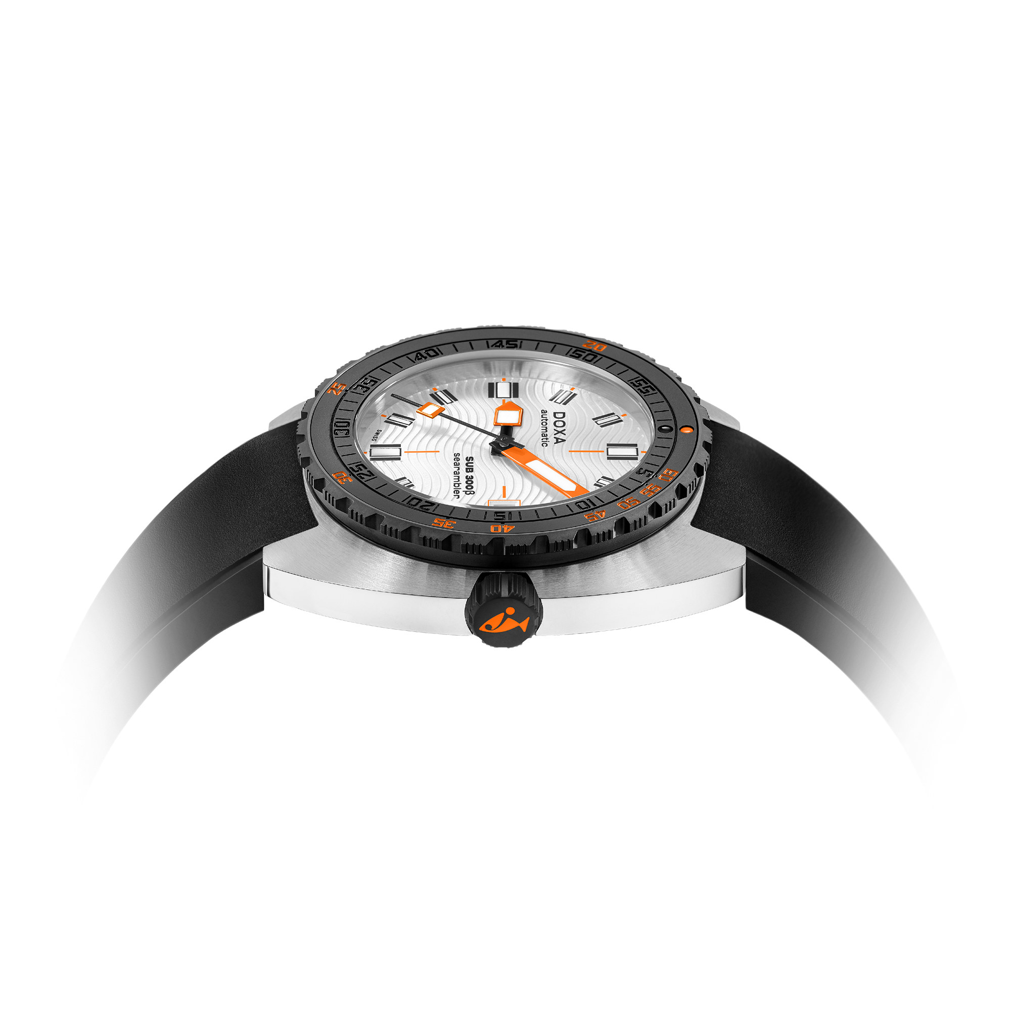 Ref. 830.10.021.20 - Die Sportuhr SUB 300β verbindet Funktionalität mit Stil; sie behält die grundlegenden Funktionen einer Werkzeuguhr in einem neu gestalteten Gehäuse mit 42,5 mm Durchmesser, das jetzt mit 11,95 mm deutlich flacher ist. Die schwarze Keramiklünette und die verschraubte Krone unterstreichen den sportlich-schicken Charakter der Uhr, der durch ein raffiniertes Zifferblatt mit Sonnenschliff ergänzt wird. Die Uhr ist mit einem FKM-Kautschukarmband oder einem Reiskorn-Edelstahlarmband erhältlich, beide mit Faltschließe und Ratsche, und bis zu 300 Meter wasserdicht. Mit kratzfestem Saphirglas, einem Schweizer Automatikwerk und einer Gangreserve von rund 38 Stunden ist die SUB 300β auf Sicherheit und Erforschungsaktivitäten ausgelegt. Getreu dem unkonventionellen Ethos von DOXA verbindet sie den Zeitgeist mit einem eleganten, modernen, sportlich-schicken Look, der auch in urbane Szenarien passt.