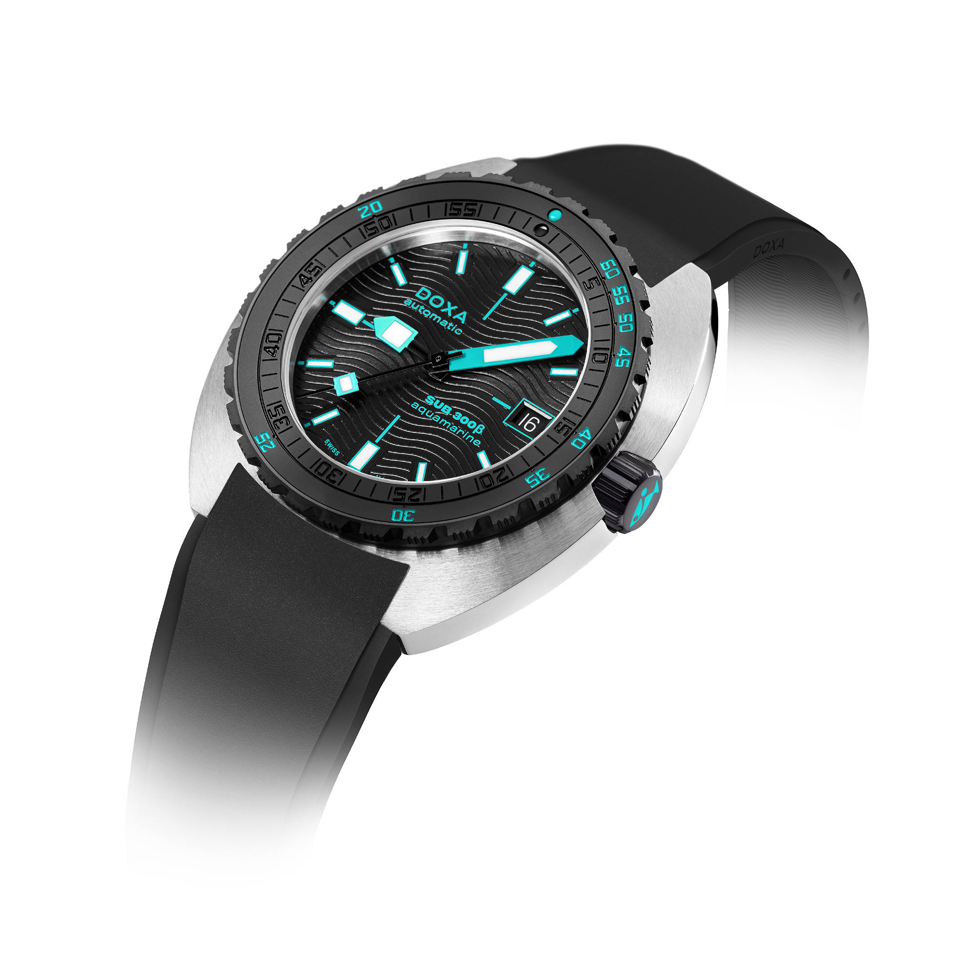 Ref. 830.10.241.20 - Die Sportuhr SUB 300β verbindet Funktionalität mit Stil; sie behält die grundlegenden Funktionen einer Werkzeuguhr in einem neu gestalteten Gehäuse mit 42,5 mm Durchmesser, das jetzt mit 11,95 mm deutlich flacher ist. Die schwarze Keramiklünette und die verschraubte Krone unterstreichen den sportlich-schicken Charakter der Uhr, der durch ein raffiniertes Zifferblatt mit Sonnenschliff ergänzt wird. Die Uhr ist mit einem FKM-Kautschukarmband oder einem Reiskorn-Edelstahlarmband erhältlich, beide mit Faltschließe und Ratsche, und bis zu 300 Meter wasserdicht. Mit kratzfestem Saphirglas, einem Schweizer Automatikwerk und einer Gangreserve von rund 38 Stunden ist die SUB 300β auf Sicherheit und Erforschungsaktivitäten ausgelegt. Getreu dem unkonventionellen Ethos von DOXA verbindet sie den Zeitgeist mit einem eleganten, modernen, sportlich-schicken Look, der auch in urbane Szenarien passt.