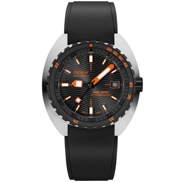 Ref. 830.10.351.20 - Die Sportuhr SUB 300β verbindet Funktionalität mit Stil; sie behält die grundlegenden Funktionen einer Werkzeuguhr in einem neu gestalteten Gehäuse mit 42,5 mm Durchmesser, das jetzt mit 11,95 mm deutlich flacher ist. Die schwarze Keramiklünette und die verschraubte Krone unterstreichen den sportlich-schicken Charakter der Uhr, der durch ein raffiniertes Zifferblatt mit Sonnenschliff ergänzt wird. Die Uhr ist mit einem FKM-Kautschukarmband oder einem Reiskorn-Edelstahlarmband erhältlich, beide mit Faltschließe und Ratsche, und bis zu 300 Meter wasserdicht. Mit kratzfestem Saphirglas, einem Schweizer Automatikwerk und einer Gangreserve von rund 38 Stunden ist die SUB 300β auf Sicherheit und Erforschungsaktivitäten ausgelegt. Getreu dem unkonventionellen Ethos von DOXA verbindet sie den Zeitgeist mit einem eleganten, modernen, sportlich-schicken Look, der auch in urbane Szenarien passt.