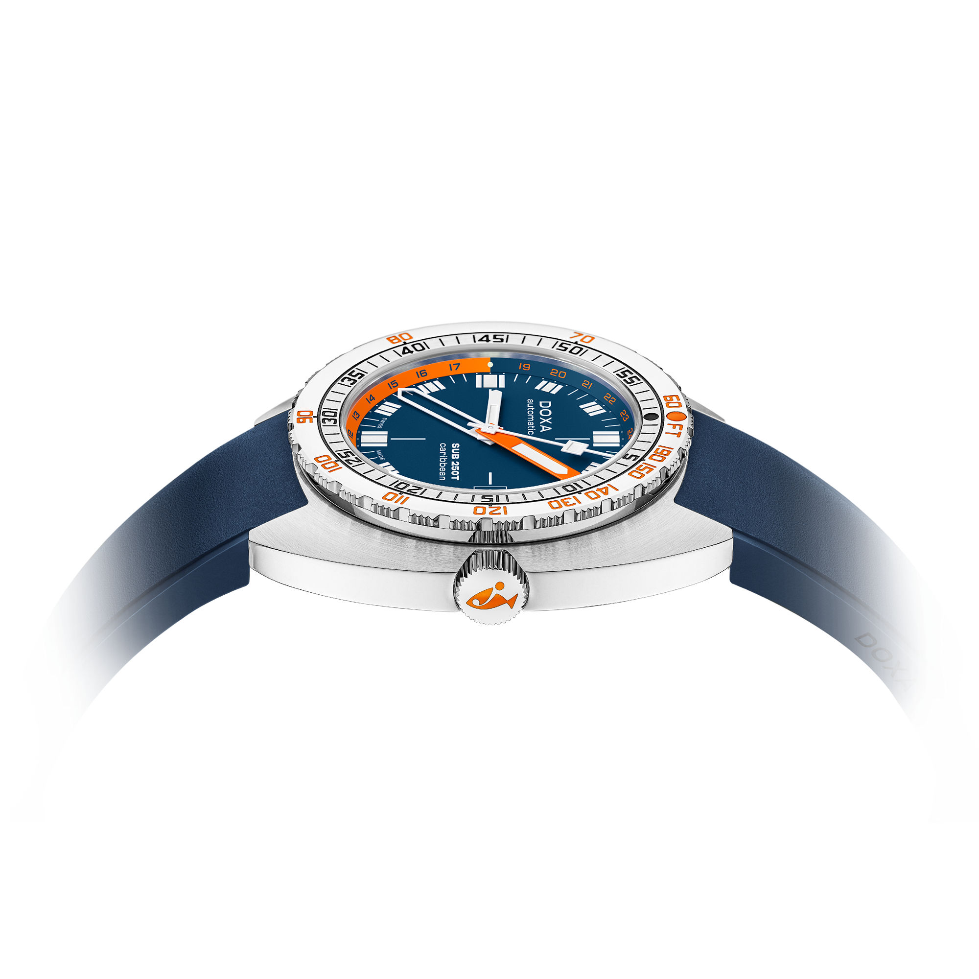 Ref. 855.10.201.32 - Die SUB 250T GMT markiert DOXAs Rückkehr zur GMT-Funktion und vereint die Robustheit einer Taucheruhr mit der Weltzeitfunktion. Ihr 40-mm-Gehäuse aus Edelstahl bietet die perfekte Balance zwischen Präsenz am Handgelenk und Tragekomfort, während die verschraubte Krone und die einseitig drehbare Lünette mit Tauchskala eine professionelle Leistung gewährleisten. Mit einer Wasserdichtigkeit von 250 Metern (820 Fuß) ist sie sowohl für Unterwasserabenteuer als auch für weltweite Reisen ausgelegt.