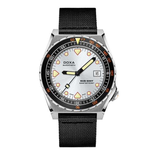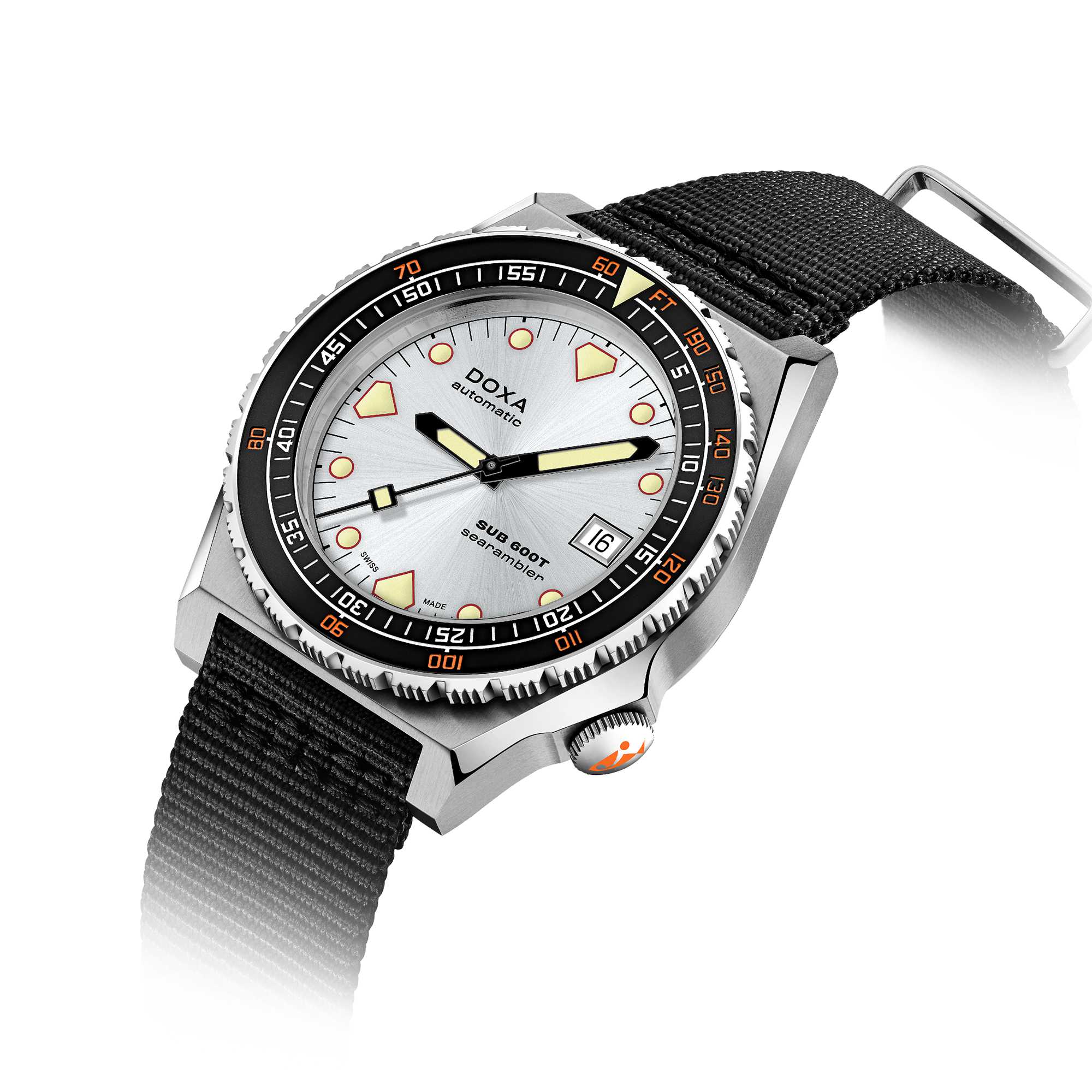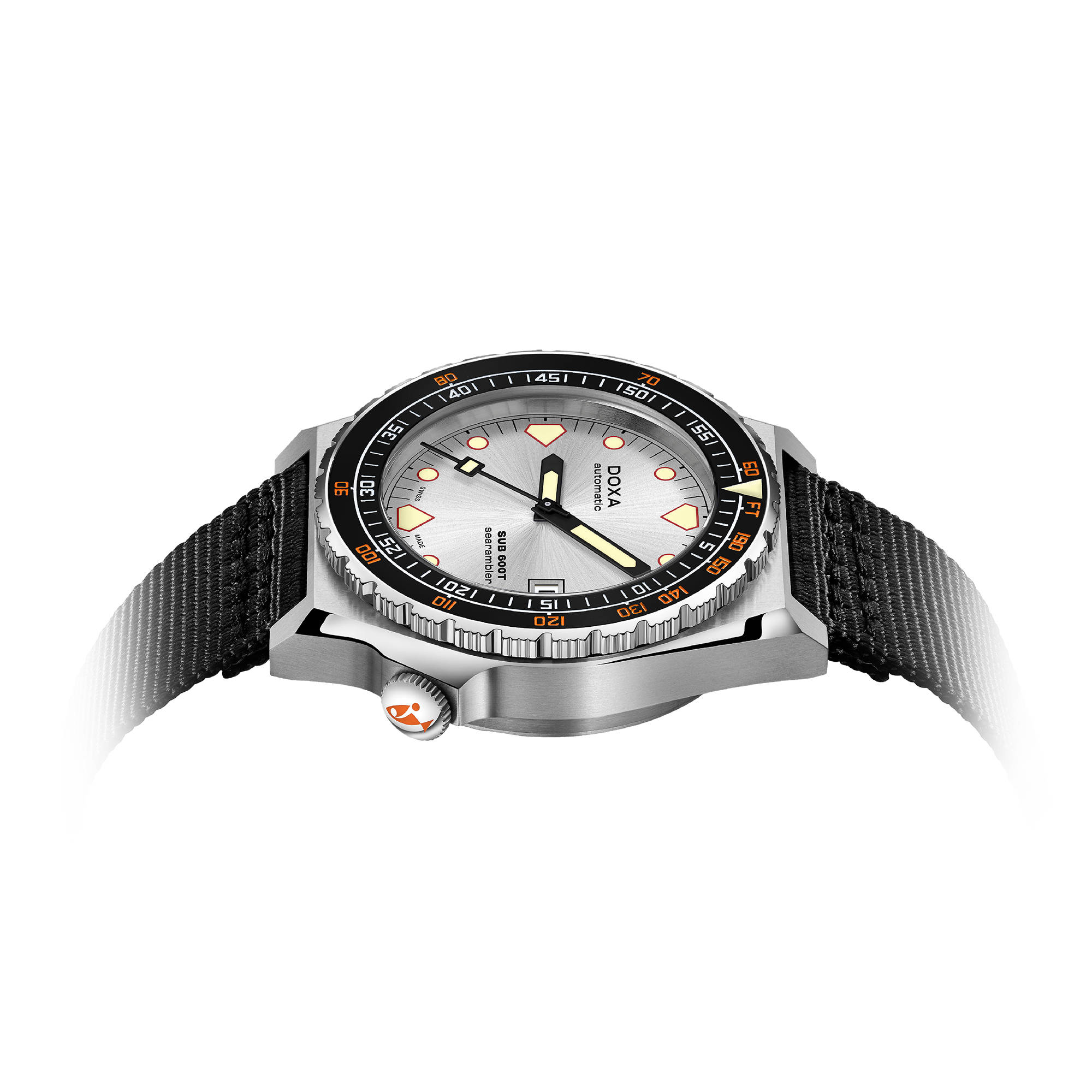 Alle tauchbezogenen Indikationen sind mit leuchtenden Super-LumiNova®-Pigmenten beschichtet, darunter auch die unverwechselbaren Stundenmarkierungen in Form eines Haifischzahns bei 6, 9 und 12 Uhr, für optimale Lesbarkeit unter schlechten Lichtverhältnissen. Zwei Armbänder stehen zur Auswahl: ein NATO-Armband, das Ton in Ton mit der Zifferblattfarbe ausgeführt ist, und ein neues Armband aus Edelstahl 316L, das der DOXA-Kollektion einen „modernen Vintage“-Touch verleiht. Das NATO-Armband verfügt über eine Dornschliesse für eine bequeme und komfortable Anpassung an das Handgelenk des Trägers sowie über Schnellwechsel-Federstege.