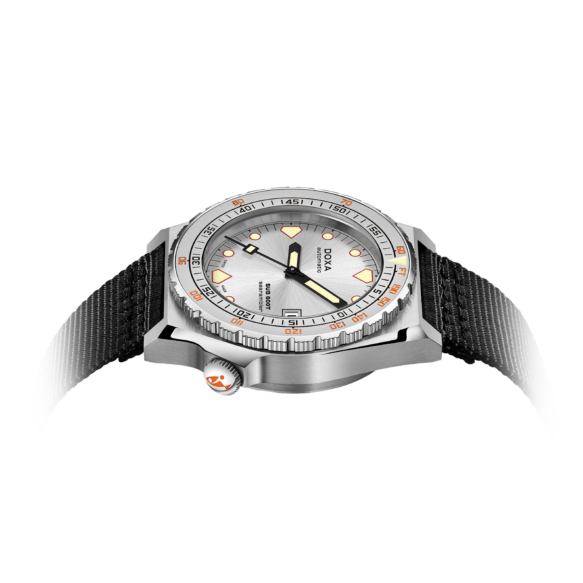 Alle tauchbezogenen Indikationen sind mit leuchtenden Super-LumiNova®-Pigmenten beschichtet, darunter auch die unverwechselbaren Stundenmarkierungen in Form eines Haifischzahns bei 6, 9 und 12 Uhr, für optimale Lesbarkeit unter schlechten Lichtverhältnissen. Zwei Armbänder stehen zur Auswahl: ein NATO-Armband, das Ton in Ton mit der Zifferblattfarbe ausgeführt ist, und ein neues Armband aus Edelstahl 316L, das der DOXA-Kollektion einen „modernen Vintage“-Touch verleiht. Das NATO-Armband verfügt über eine Dornschliesse für eine bequeme und komfortable Anpassung an das Handgelenk des Trägers sowie über Schnellwechsel-Federstege.