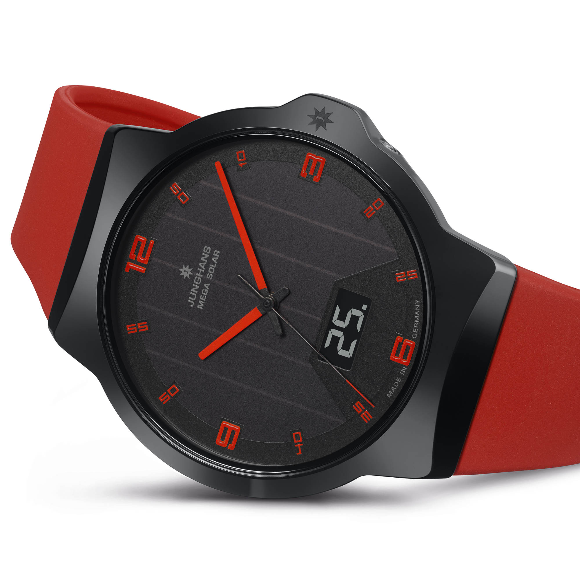 Ref. 18/1402.00 - Junghans ist Pionier der Funkuhrentechnik und auch in Sachen Sonnenenergie für Uhren ganz vorne dabei. Diese beiden Technologien werden im Modell Force Mega Solar vereinigt. Das Connected Funk-Solarwerk Kaliber J615.84 bezieht seine Energie aus einem Speicher, der über Solarmodule im Zifferblatt kontinuierlich aufgeladen wird. Das Ganze steckt in einem Keramikgehäuse, das gleichermaßen leicht und kratzfest ist. Diese Uhr kombiniert hohen Tragekomfort und Coolness mit enormer Alltagstauglichkeit.