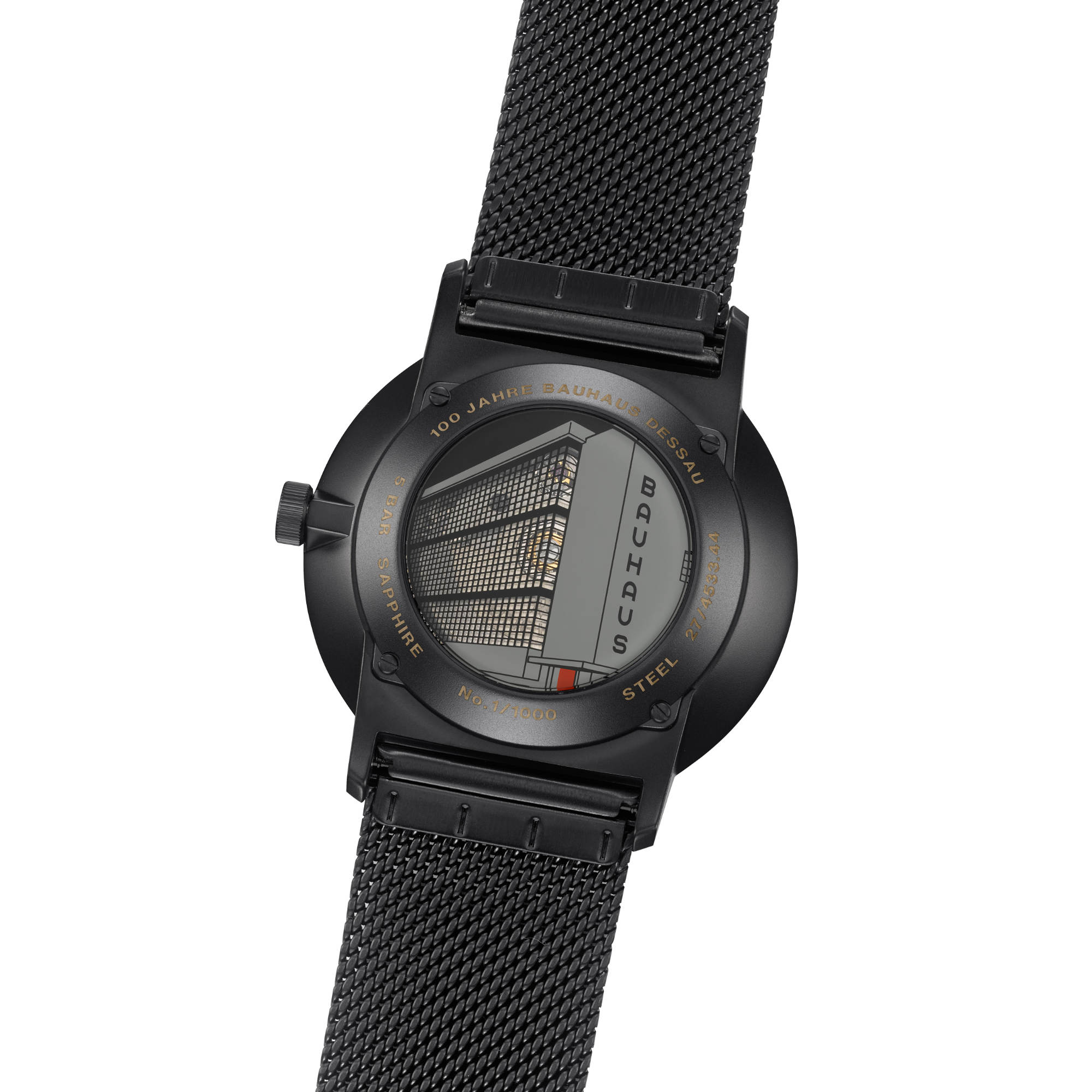 Ref. 27/4533.44 - Mit der FORM A Bauhaus feiern wir 100 Jahre Bauhaus in Dessau. Neben Formen waren Farben ein wesentlicher Bestandteil der Lehren am Bauhaus. Das Zifferblatt dieser auf 1000 Exemplare limitierten Uhr zeigt einen Farbkreis auf den 12 Stundenmarkierungen, der auf den Primärfarben basiert. Durch die Fenster eines Bauhaus-Abbilds auf dem Gehäuseboden kann man sehen, wie das mechanische Werk im Inneren arbeitet.