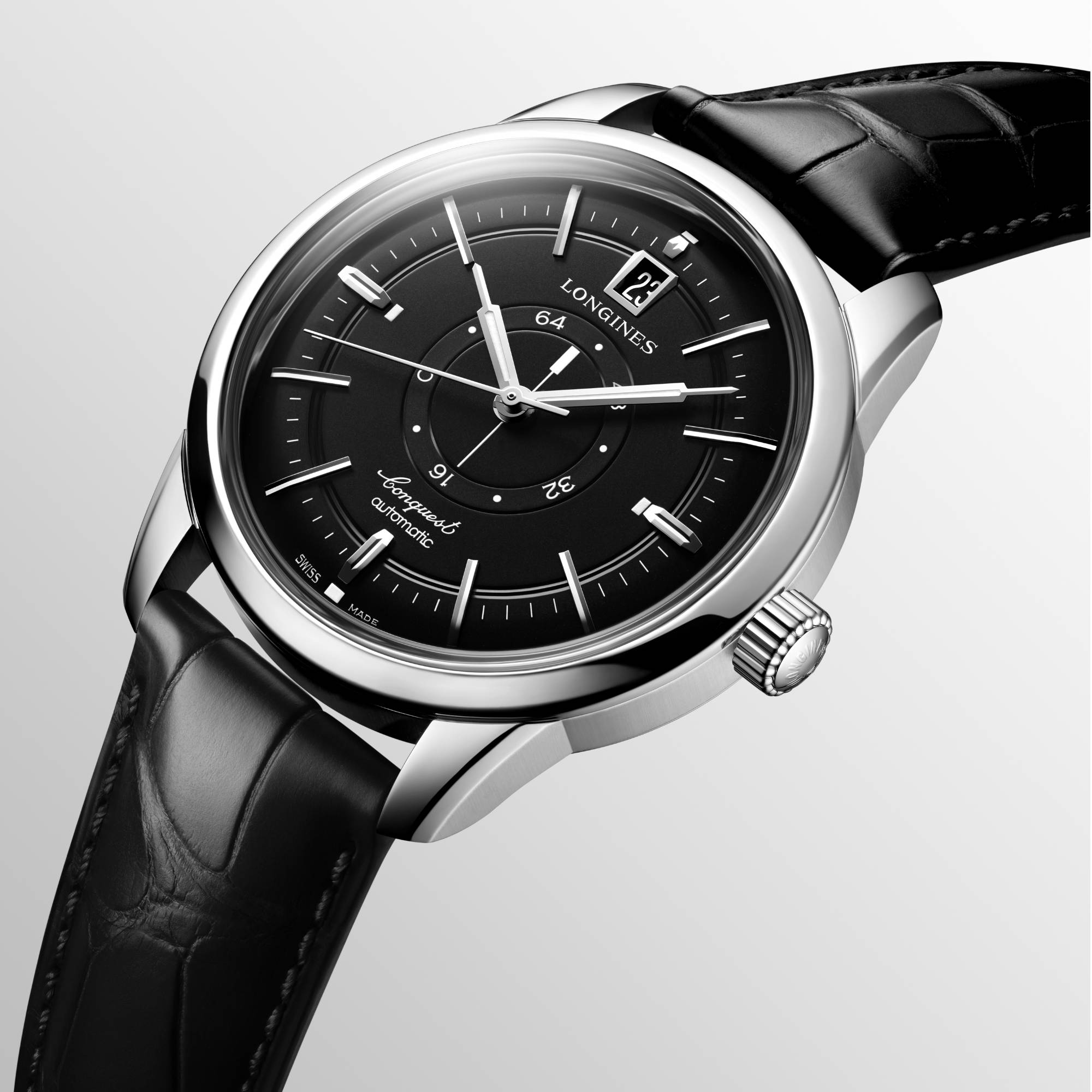 Ref. L1.648.4.52.2 - Longines präsentiert die neue CONQUEST HERITAGE CENTRAL POWER RESERVE mit einem Gehäuse von 38 mm Durchmesser. Mechanisches Uhrwerk mit automatischem Aufzug, exklusives Longines Kaliber L896.5 mit Gangreserve auf rotierenden Scheiben in der Mitte des Zifferblatts. Ein ikonisches Modell mit schwarzem Zifferblatt und integriertem schwarzen Alligatorlederarmband anlässlich des 70-jährigen Jubiläums der Kollektion Conquest.Ihr Ansprechpartner
