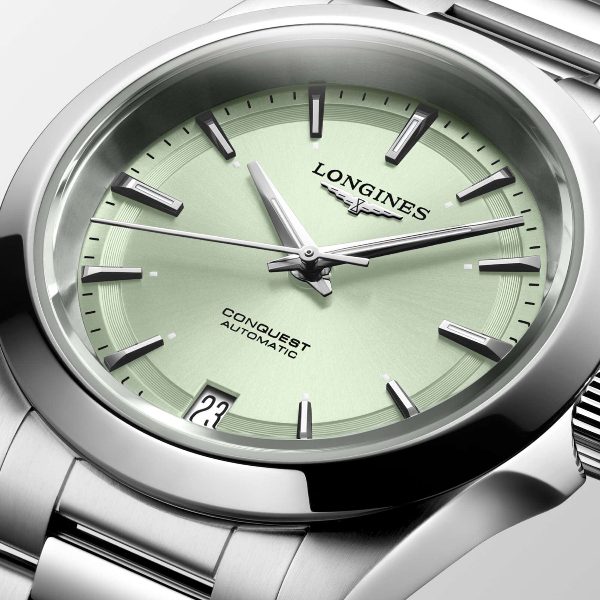 Ref. L3.430.4.02.6 - Diese neue Conquest wird von einem exklusiven mechanischen Longines-Uhrwerk mit Automatikaufzug angetrieben. Das 34 mm große Stahlgehäuse ist bis zu 10 bar (100 m) wasserdicht und verfügt über ein pastellgrünes Zifferblatt mit Sonnenschliff, rhodinierten Zeigern und applizierten rhodinierten Stundenmarkierungen mit Super-LumiNova®-Beschichtung. Die Datumsanzeige befindet sich bei 6 Uhr. Die Uhr wird mit einem Edelstahlarmband geliefert.Ihr Ansprechpartner