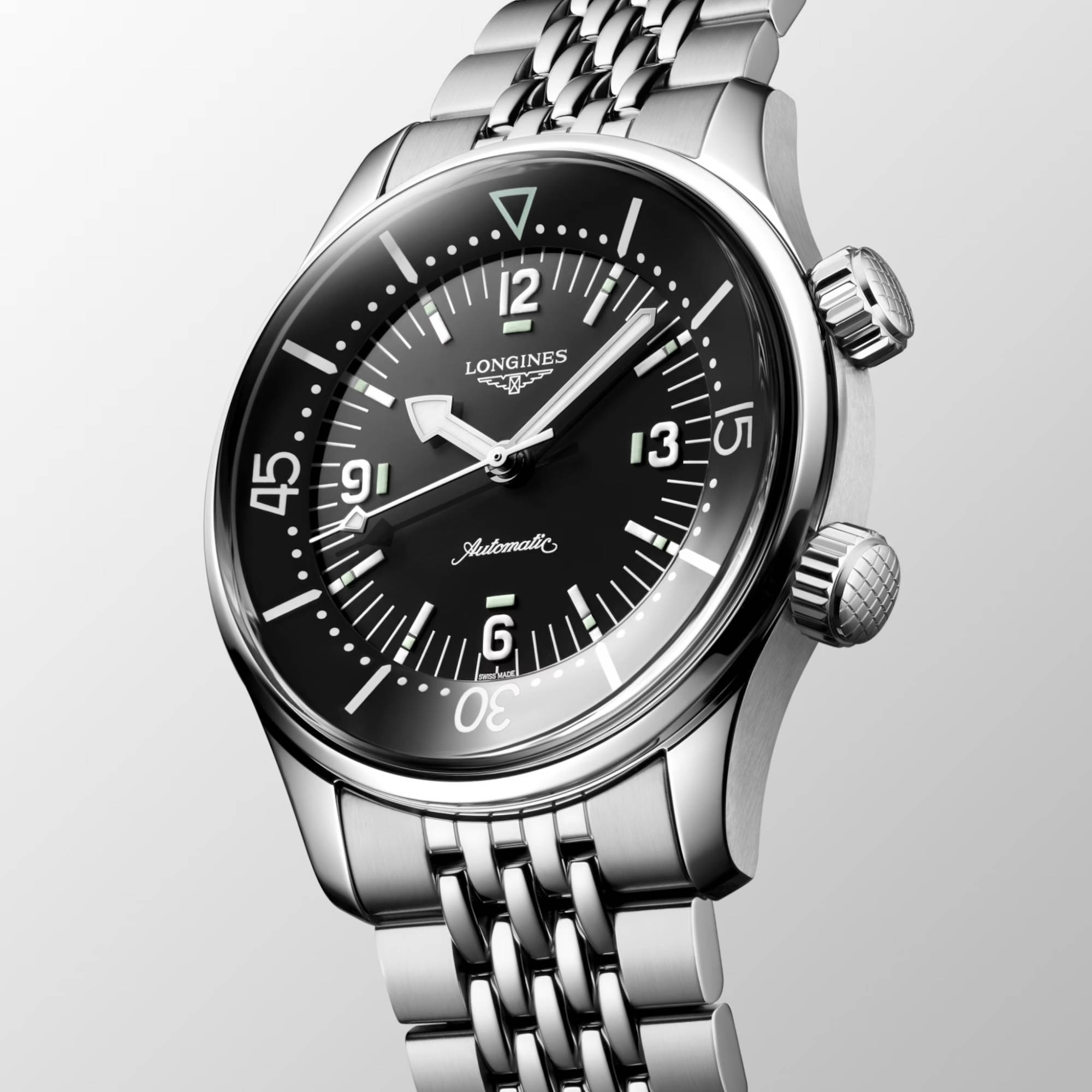 Ref. L3.764.4.50.7 - Die Longines Legend Diver wurde ursprünglich für die Erkundung der Unterwasserwelt entwickelt und ist sowohl an Land als auch unter Wasser zu Hause. Mit ihrem zeitlosen Design und ihrer bahnbrechenden Leistung ist sie seit 1959 eine echte Ikone der Uhrmacherei. Auf den ersten Blick fällt sie durch ihre zwei Kronen und die innere drehbare Lünette auf. Die von Longines erfundene Position der Lünette im Inneren des Gehäuses schützt sie vor versehentlichen Einstellungsänderungen und Stößen. Diese echten Werkzeuguhren werden von exklusiven Longines Kalibern angetrieben, die mit einer Unruhspiralfeder aus Silizium ausgestattet sind. Die Kollektion ist in einer Reihe von Größen, Materialien und Farben erhältlich.