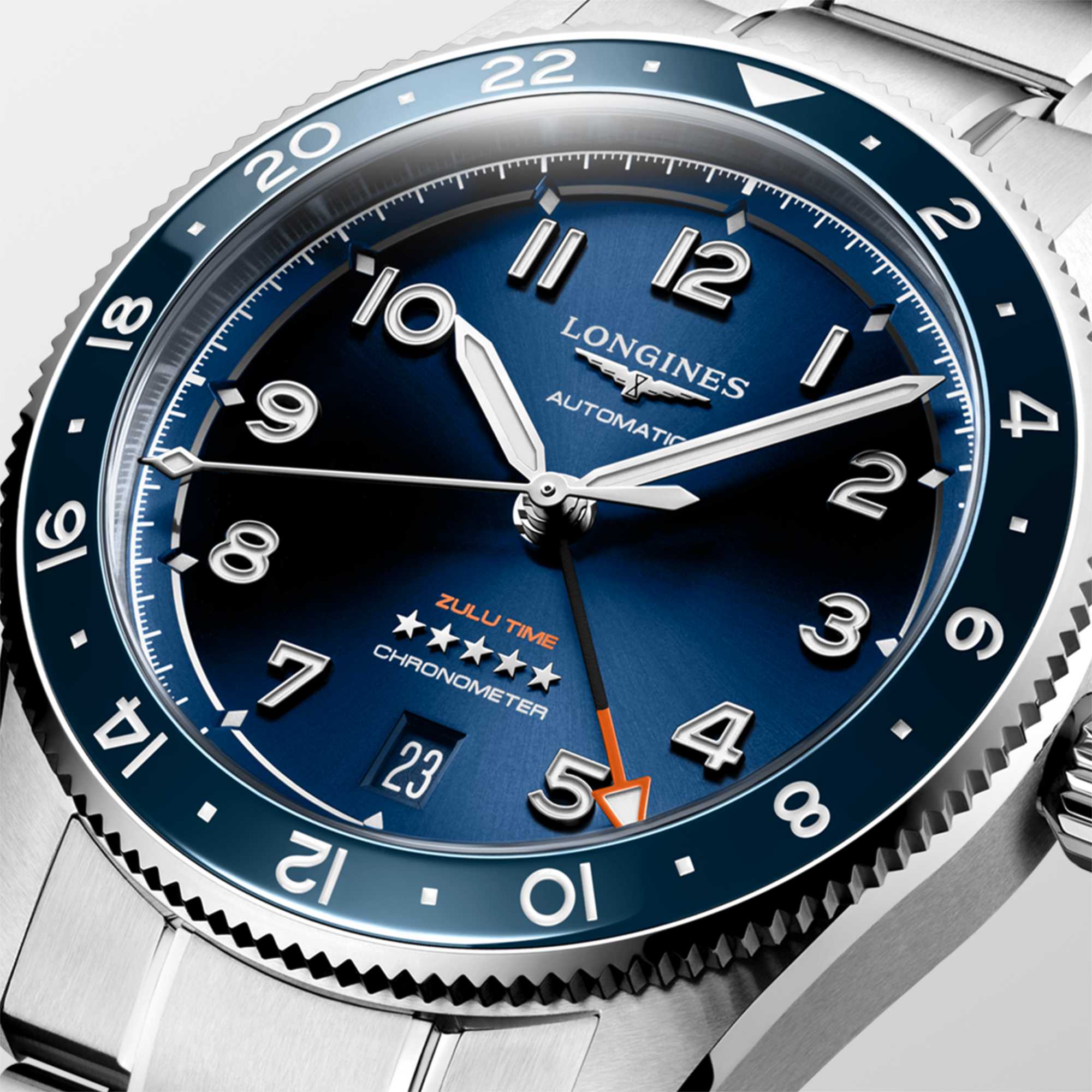 Ref. L3.802.4.93.6 - Mit der Lancierung der Longines Spirit Zulu Time im Jahr 2022 hat die Marke mit der geflügelten Sanduhr ein neues Kapitel in ihrer bereits ereignisreichen Geschichte geschrieben. Dieser Zeitmesser mit mehreren Zeitzonen ist eine Fortsetzung der Präzisionsinstrumente von Longines, die von den größten Pionieren der Welt bei ihren legendären Heldentaten getragen werden. Diese moderne Legende wird nun durch die neue Longines Spirit Zulu Time in einem ergonomisch angenehmen und eleganten 39-mm-Gehäuse fortgeschrieben. Dieses Modell verfügt über eine Lünette mit einem blauen Keramikeinsatz und ist mit einem sonnenstrahlblauen Zifferblatt mit einem Datumsfenster erhältlich, das auf der 6-Uhr-Position zentriert ist. Das 39-mm-Stahlgehäuse hat ein elegantes austauschbares Edelstahlarmband.Ihr Ansprechpartner