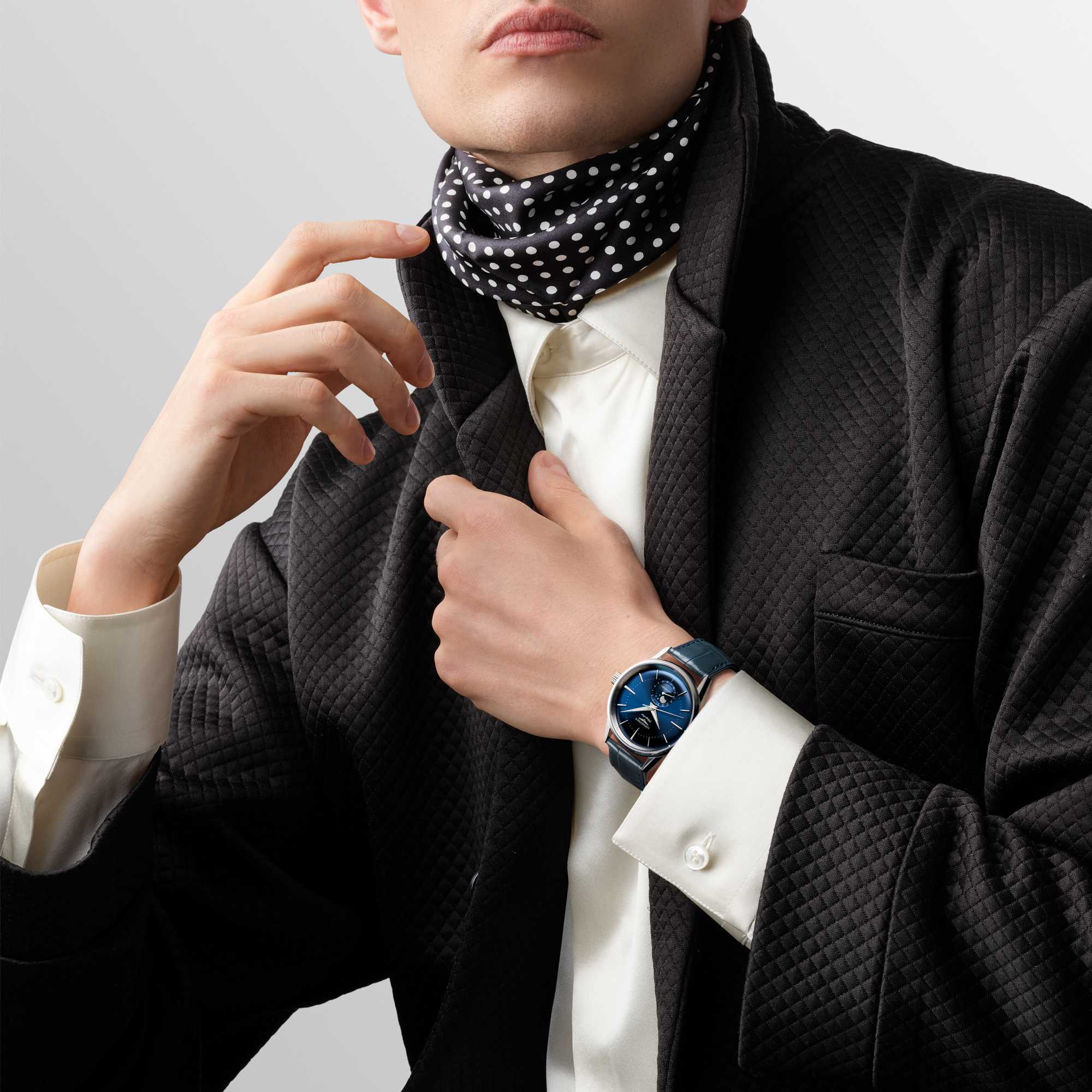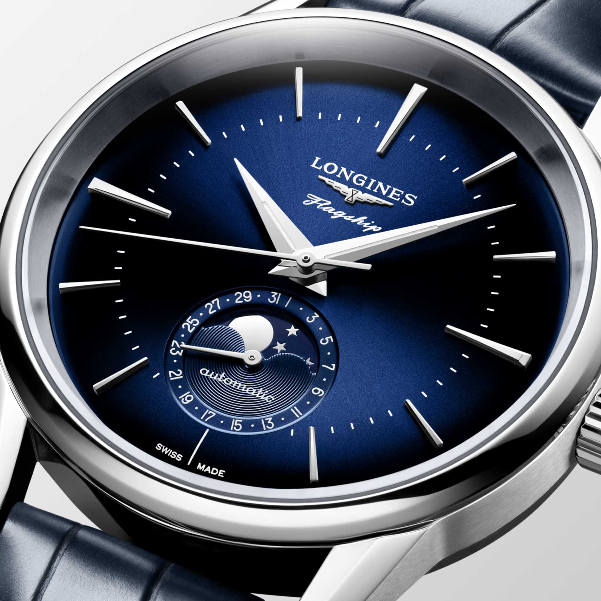 Ref. L4.815.4.92.2 - Die Flagship Heritage Linie wird um neue Varianten mit Mondphasenkomplikation erweitert. Sie befindet sich auf einem Hilfszifferblatt mit Zeigerdatum, das bei 6 Uhr platziert ist. Ihr Uhrwerk, das exklusiv bei Longines zum Einsatz kommt, ist magnetresistent und mit einer Spiralfeder aus Silizium ausgestattet. Das Edelstahlgehäuse mit verschraubtem Boden hat einen Durchmesser von 38.5 mm. Es ist satiniert und gebürstet, mit verkürzten und abgeschrägten Bandanstössen. Dieses Modell mit dem gewölbten blauen Zifferblatt mit Sonnenschliff ist mit elf applizierten Indizes und rhodinierten Zeigern versehen. Es ist mit einem blauen Lederarmband mit einer neuen Heritage-Dornschliesse bestückt.Ihr Ansprechpartner