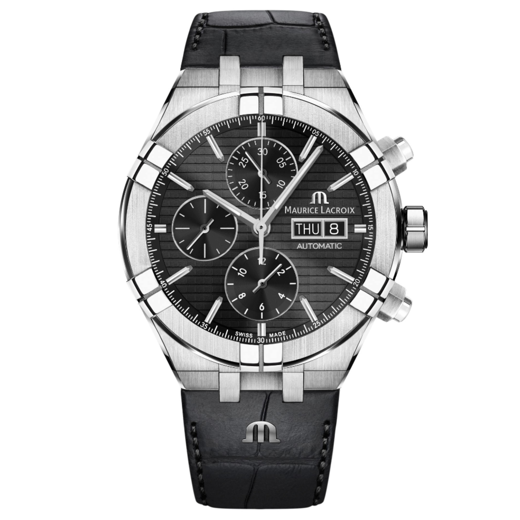 Ref. AI6038-SS001-330-1 - AIKON, auf dem Weg zum Erfolg mit der Automatic! - Maurice Lacroix hatte sie angekündigt, nun ist sie endlich da. Zwei Jahre nach der Markteinführung der Quarzversion wurde das Modell mit historischen Wurzeln umgestaltet, um automatische Kaliber aufzunehmen. Das Ergebnis: die AIKON Automatik und die AIKON Automatik Chronograph. - Die AIKON Automatic Chronograph zeigt ihrerseits eine noch robustere Optik. Der Durchmesser von 44 mm erklärt sich durch die Verwendung eines automatischen Chronographenkalibers. Auch dieser ist dank einer verschraubten Krone, eines verschraubten Gehäusebodens und verschraubter Drücker bis 200 Meter wasserdicht. Insgesamt sind seit der Lancierung fünf Versionen mit Zifferblättern in den Farben Blau, Silber und Schwarz erhältlich. Die silberfarbenen Zifferblattvarianten werden durch blaue Chronographenzähler ergänzt, die einen sehr modischen Panda-Zifferblatt-Effekt erzeugen. - Die AIKON Automatic führt ein schnelles Armbandwechselsystem namens Easy-Change ein, das die Funktionalität und Ergonomie der Uhren weiter verbessert. Dank einer Zwei-Stift-Vorrichtung lässt sich das Armband ganz einfach an die Stimmung, Kleidung und Wünsche des Trägers anpassen.Ihr Ansprechpartner