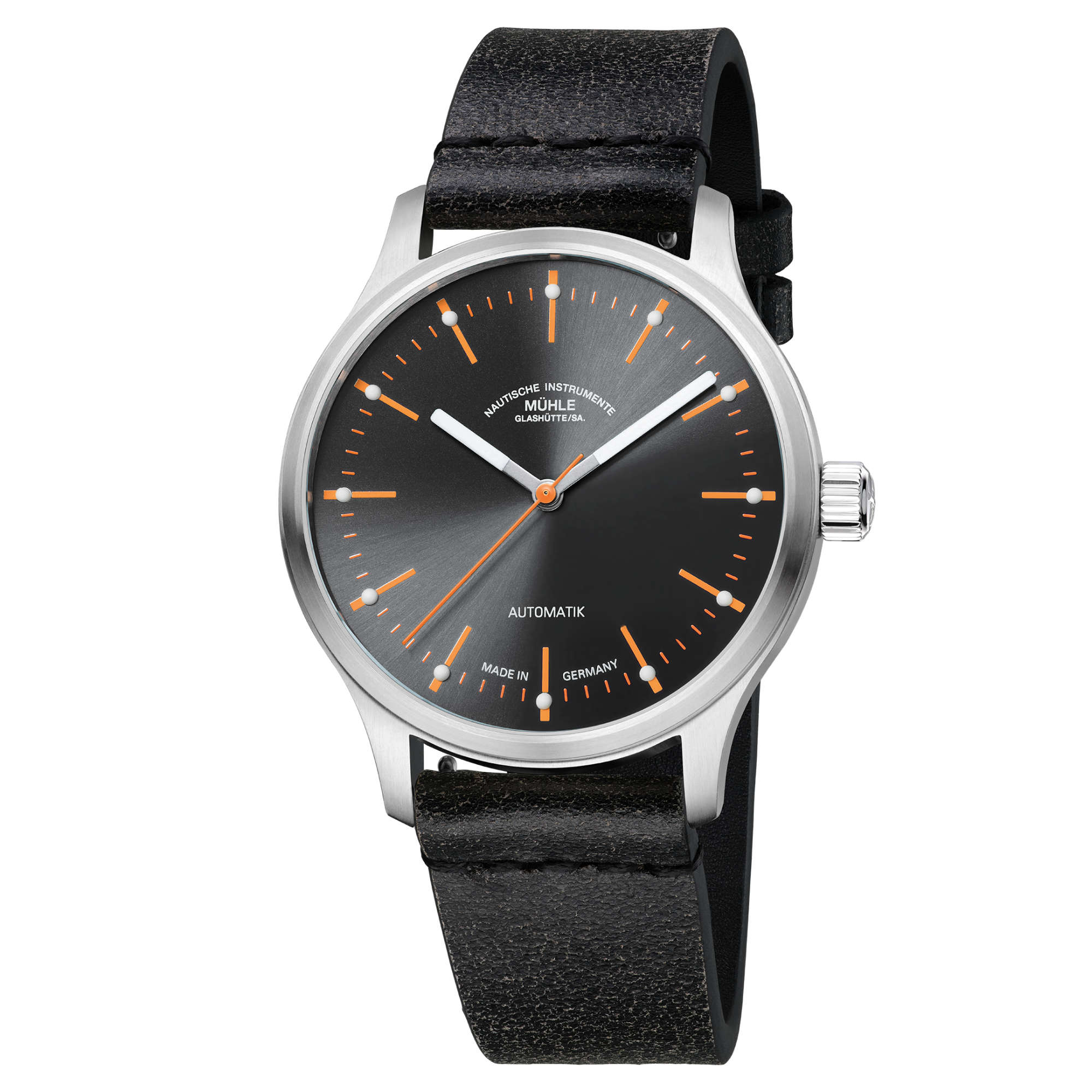 Ref. M1-40-75-LB-III - Seriöses Grau trifft auf kreatives Orange, traditionelle Mechanik auf lifestyliges Design, luxuriöse Anmutung auf perfekte Watch-Life-Balance: Die Panova Grau bezieht ihren besonderen Reiz aus spannungsreichen Gegensätzen. Diese verleihen der neuen Mühle-Uhr eine ganz eigene Ästhetik und einen vielschichtigen Charakter. Das beste Beispiel dafür ist das grau-metallische Zifferblatt mit seinem facettenreichen Licht- und Schattenspiel.Ihr Ansprechpartner