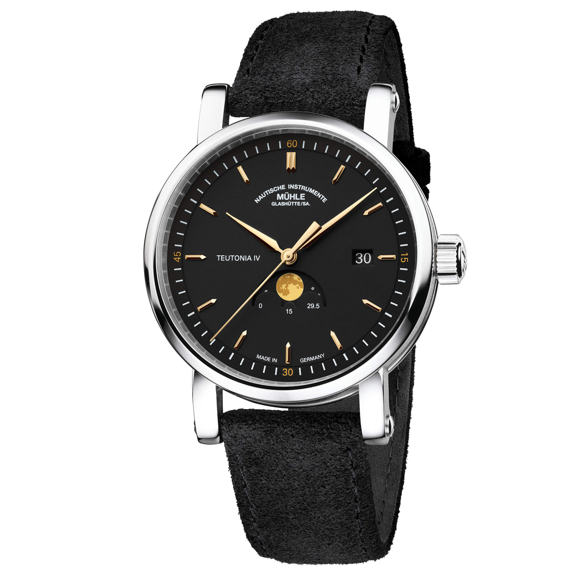 Ref. M1-44-03-AB-I - Mal ist er 360.000 – mal 405.000 Kilometer von der Erde entfernt. Mal sehen wir ihn als schmale, weiße Sichel – mal sorgt er als blutroter Vollmond für magische Nächte: Der Mond der Erde übt eine ganz besondere Faszination auf uns aus. Die Teutonia IV Mondphase bringt ihn nun direkt an unser Handgelenk. Mit ihrem Zifferblatt in eleganten Gold- und Anthrazit-Tönen informiert sie hier auf besonders stilvolle Weise über die verschiedenen Mondphasen.