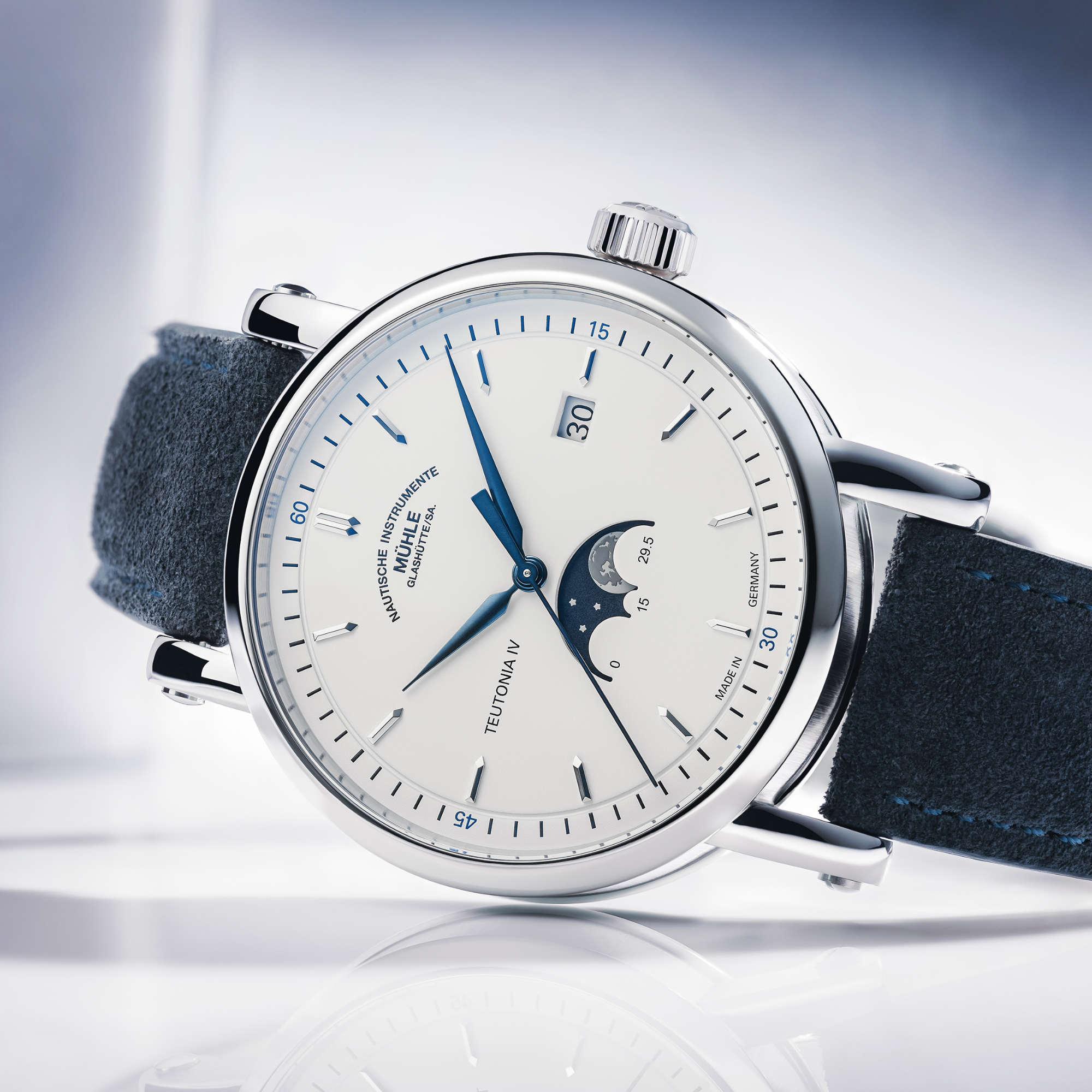 Ref. M1-44-05-LBV-I - 50 Jahre Mondlandung hin oder her: Für alle, die auch bei diesem Thema anders ticken, gibt es noch viel Spannenderes über den Mond zu berichten. Dass er sich in den letzten 50 Jahren fast zwei Meter von der Erde entfernt hat und sich irgendwann ganz von ihr lösen wird, zum Beispiel. Oder dass es seit 2019 eine Teutonia von Mühle-Glashütte gibt, die den Mond in einem Fenster bei sechs Uhr für alle Ewigkeit einfängt.