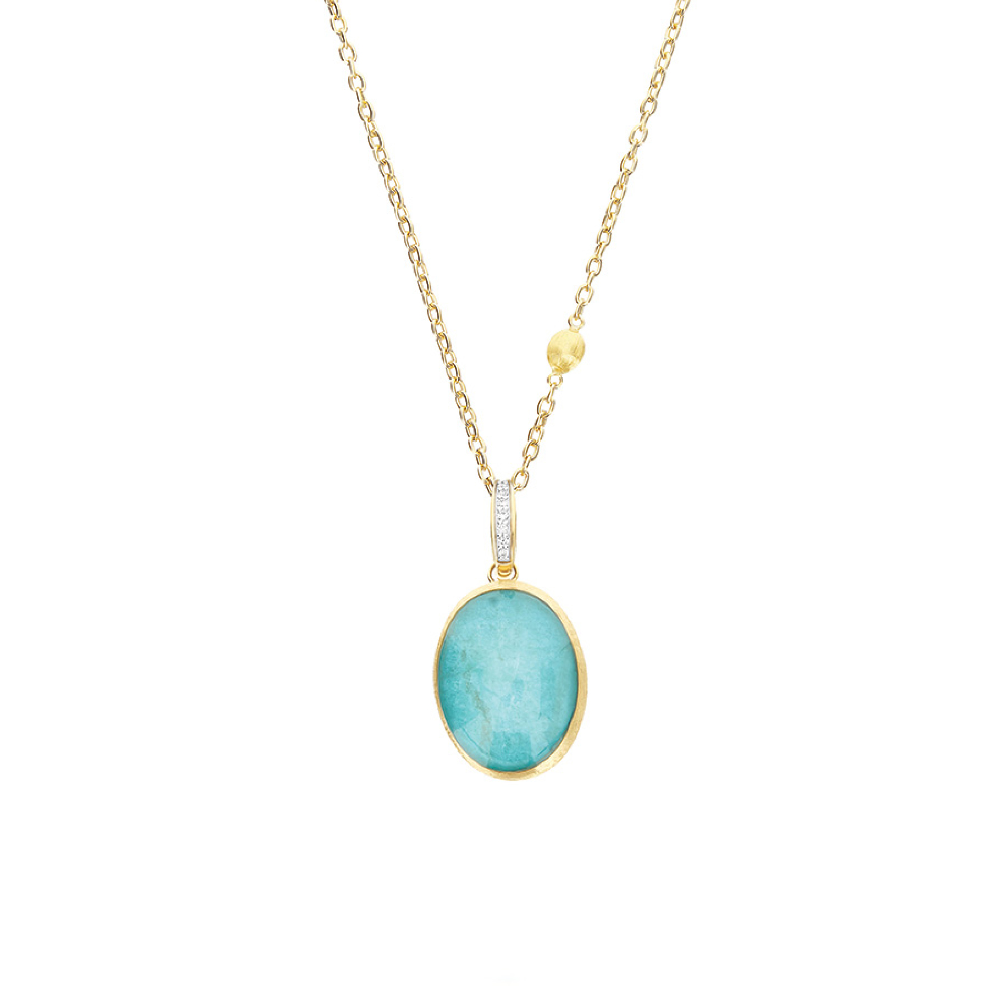 Ref. PS9-609 - Unsere Boule, die wir seit über dreißig Jahren immer wieder überdenken und neu interpretieren, wird in diesem Schmuckstück zu einem kostbaren und farbenfrohen Charm. Von dem einhüllenden und gewürzten Aroma des Anis inspiriert, der für die mediterrane Kultur so charakteristisch ist, umarmt in diesem Anhänger das 18kt Gold eine Dublette aus Bergkristall und Amazonit, der durch seinen intensiven und tiefen grün-blauen Farbton beeindruckt. Ein Juwel, das deinen Stil zu bereichern und personalisieren weiß, designt, um mit den Ketten der Kollektion Boules kombiniert zu werden, oder mit den Essentials Halsketten, dank seines praktischen Verschlusses.