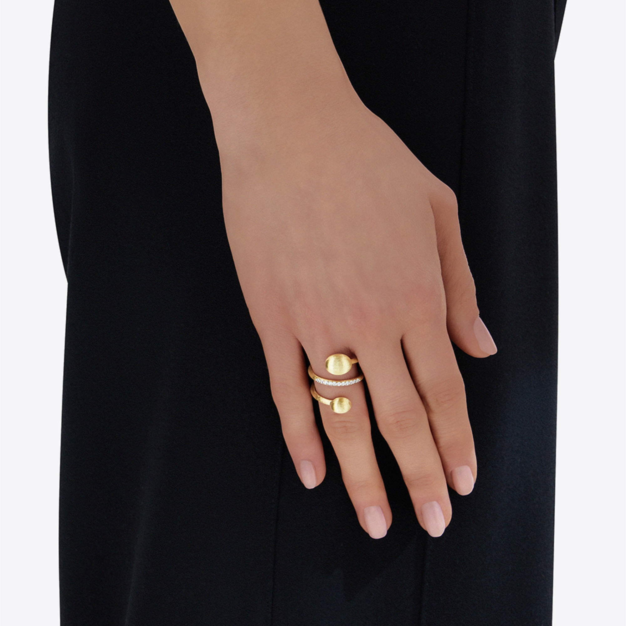 Ref. AS4-583 - Eine Ode an die Eleganz, welche alle Regeln bricht, und mit Raffinesse Formen und Details neu erfindet. Eine leuchtende Reihe Diamanten umarmt eine Spirale aus 18kt Gelbgold in einem sinnlichen und strahlenden Tanz.
