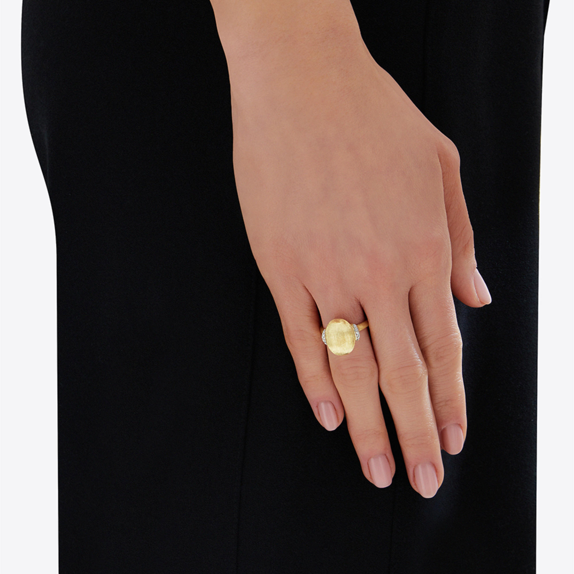 Ref. AS8-575 - Unsere ikonische Kugel aus 18kt Gold, eine Form, die uns seit Anbeginn begleitet, wird in diesem Ring in der “large“ Version ausgelegt, wodurch sie noch geschmeidiger und sinnlicher wird. Es umarmen sie Diamantenreihen mit Brillantschliff, die den Schmuck umso heller leuchten lassen.