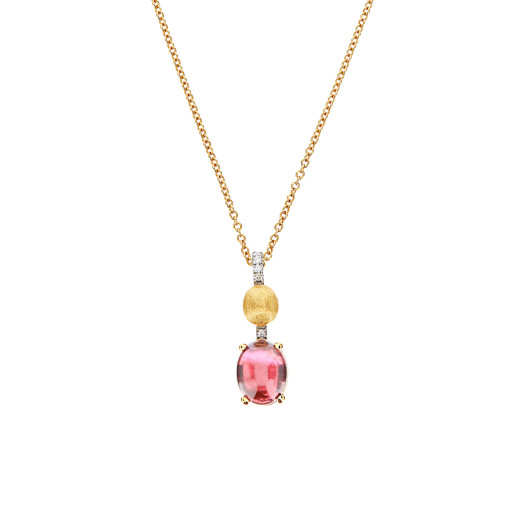 Ref. CS4-598 - Eine romantische und zeitlose Eleganz hebt diesen anspruchsvollen Anhänger aus 18kt Gold und Diamanten hervor, der von einer Kugel aus rosa Turmalin gekrönt wird. Dieser Stein, der seine Intensität je nach Blickwinkel verändert, ist einer der außergewöhnlichsten, die uns die Natur schenkt, und seine charakteristischen inneren Streifen machen jedes Schmuckstück einzigartig und unnachahmlich.Ihr Ansprechpartner