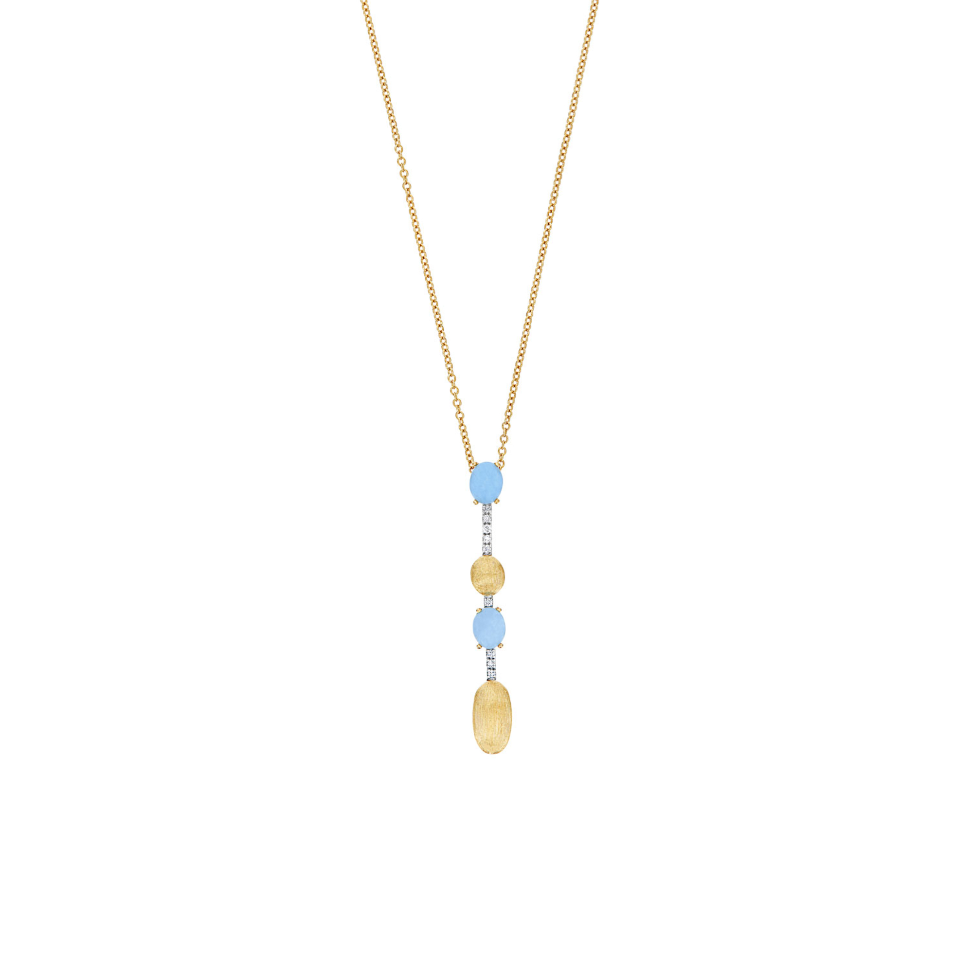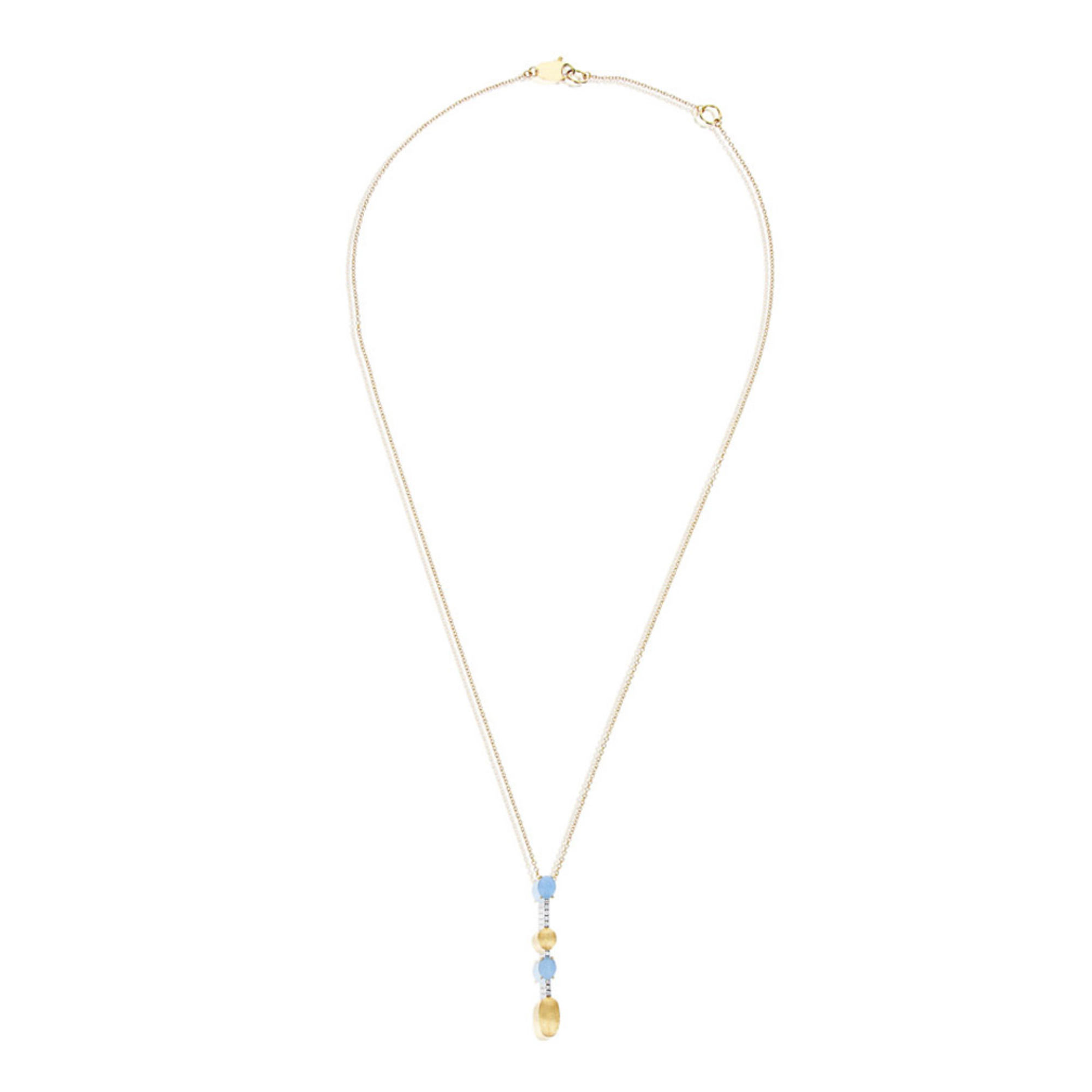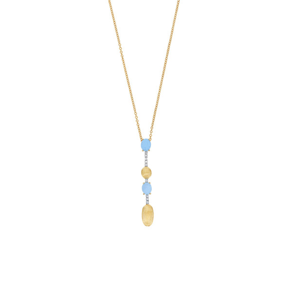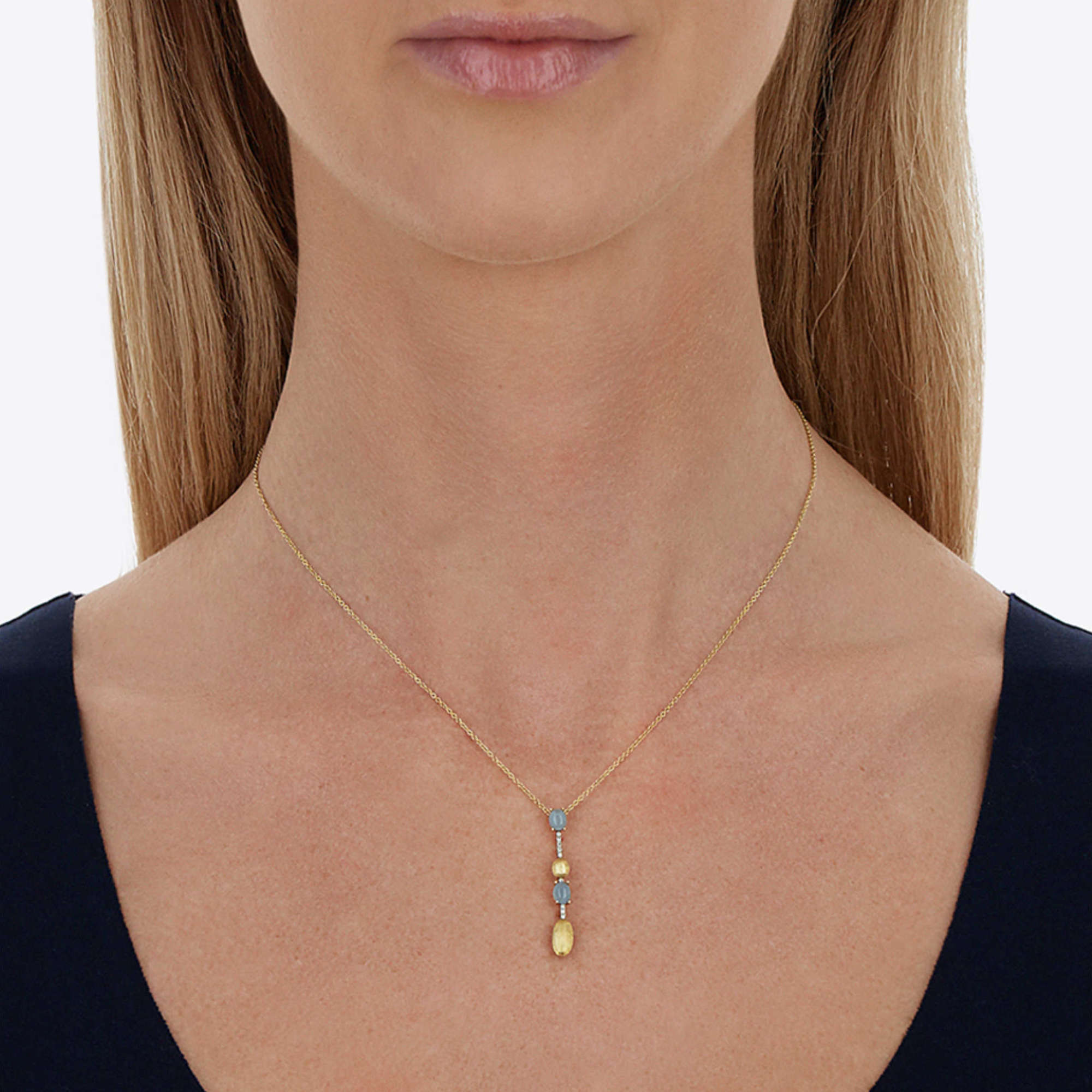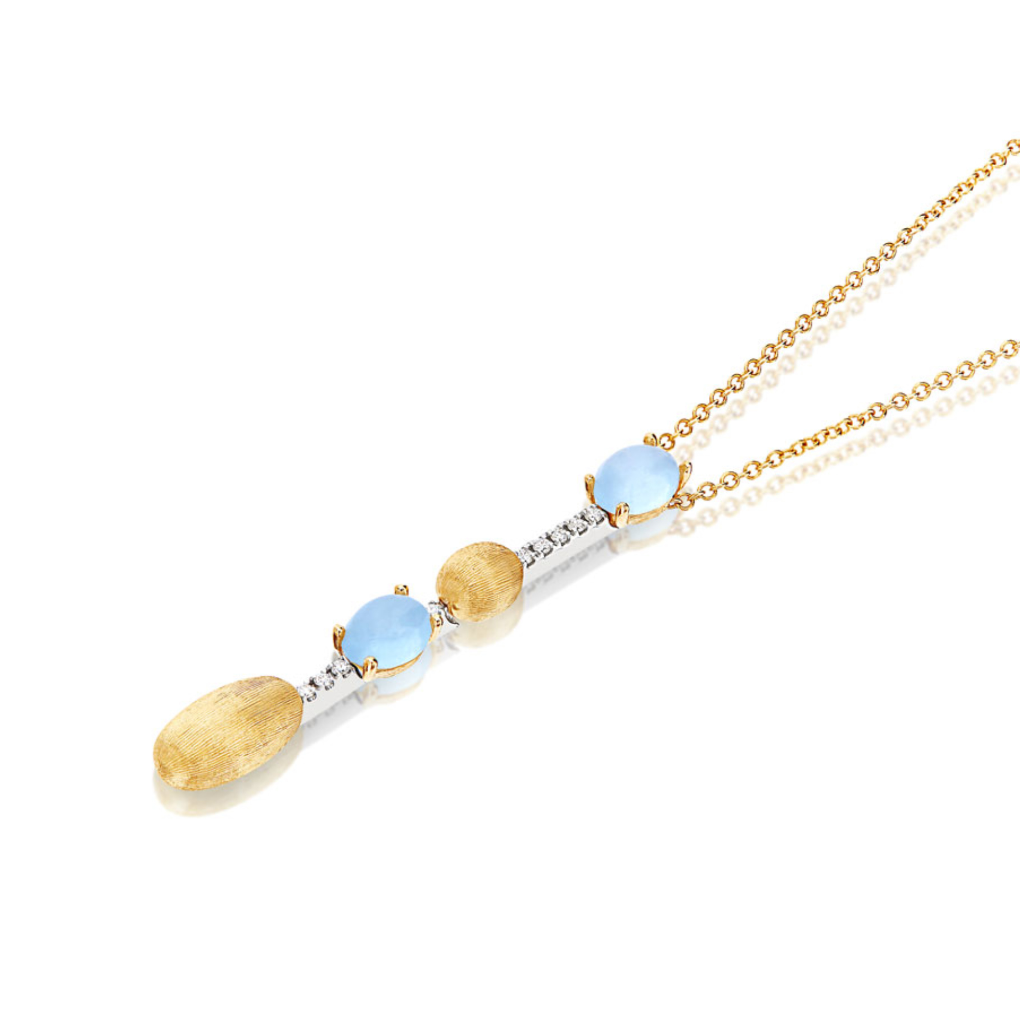 Ref. CS5-597 - Eine raffinierte Halskette aus 18kt Gold und Milky Aquamarin, gekrönt von eleganten Details aus Diamanten. Die ausgeklügelte Verarbeitung des Goldes spielt mit dem Licht und dem Naturstein, der auch für seine Fähigkeit bekannt ist, inneres Wachstum und Selbstreflexion zu begünstigen.