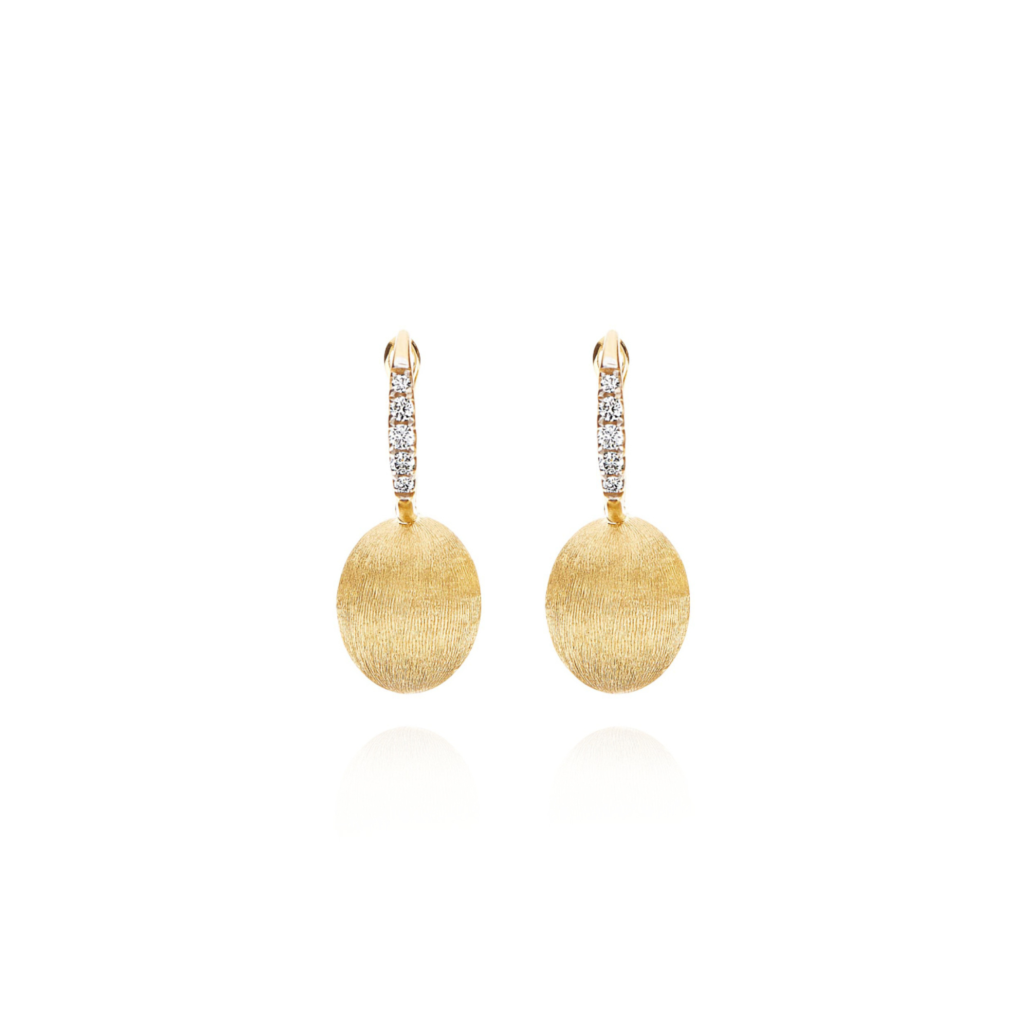 Ref. OS17-583 - Raffinierte Ohrringe aus 18kt Gold, gekrönt von eleganten Details aus Diamanten. Die ausgefeilte Bearbeitung des Goldes spielt mit dem Licht, spiegelt es suggestiv wider, und besiegelt dadurch die Begegnung von Natur und Handwerk.Ihr Ansprechpartner
