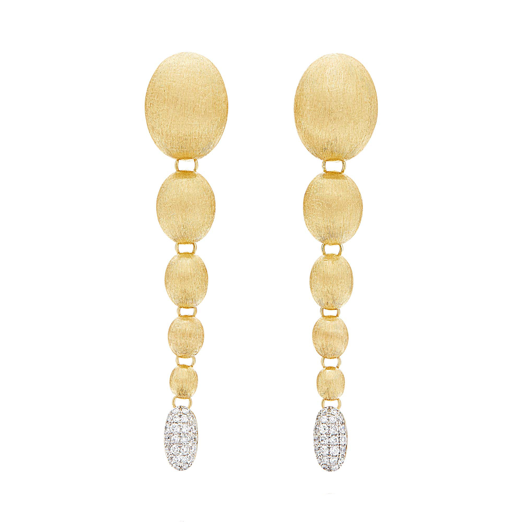 Ref. OS21-538 - Elegante Kugeln aus 18kt Gold, von Hand mit handwerklichem Wissen graviert, reihen sich in diesen Ohrringen von modernem Geschmack aneinander, gekrönt von einem Diamantenregen. Für diese Ohrringe wurden spezielle Stecker entwickelt, die über eine Lamelle verfügen, die den oberen Teil des Ohrringes stützt und dadurch einen perfekten Sitz garantiert.