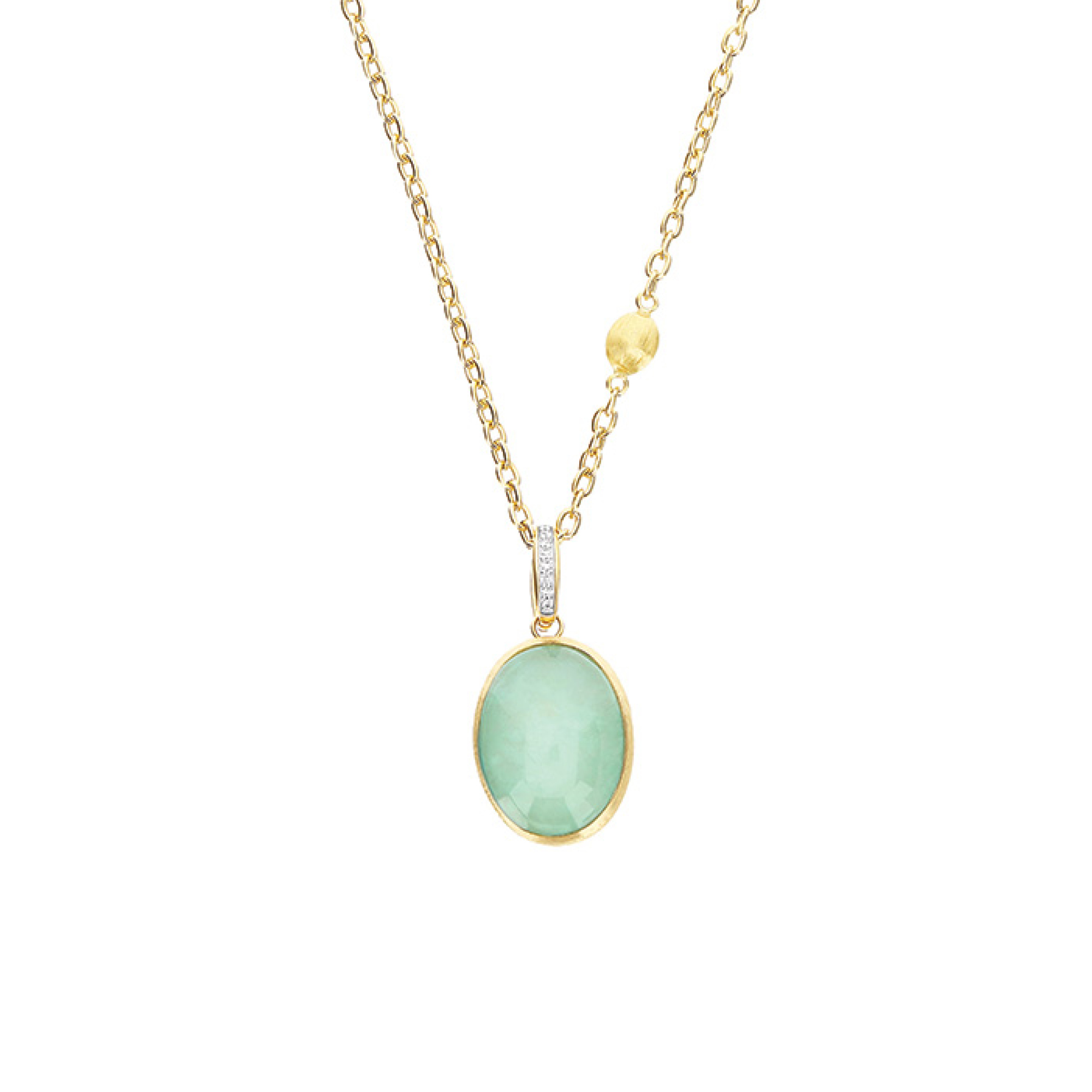 Ref. PS8-609 - Unsere Boule, die ikonische Form von Nanis, die sich seit über 30 Jahren in ständiger Evolution befindet, verwandelt sich, und wird zu einem kostbaren Charm in lebhaften und prickelnden Farben, inspiriert von einem der bekanntesten italienischen Getränke der 70er Jahre: "Latte e menta", die Milch mit Minze. In diesem Juwel begegnet das 18kt Gold einer Dublette aus Bergkristall und Jadeit, und erweckt einen Anhänger zum Leben, der dazu gedacht ist, deine Nanis Juwelen dank seines praktischen Verschlusses mit Klasse und Eleganz zu personalisieren.