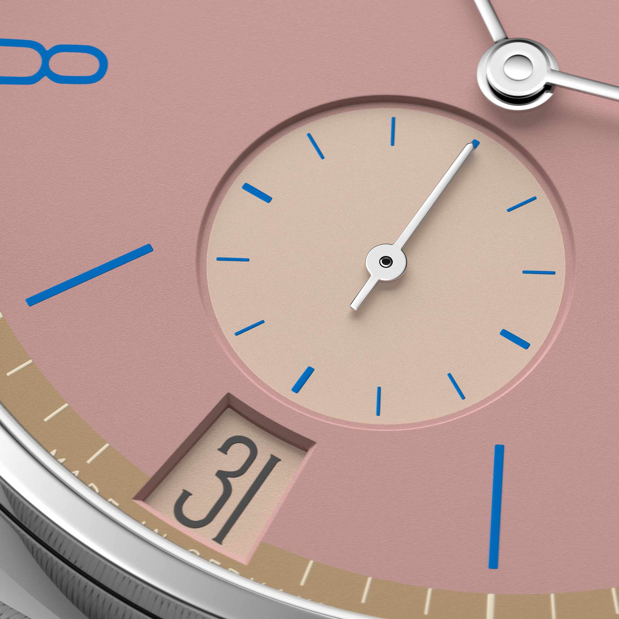 Ref.179.S15 - Die Ikone in Farbe. Voller Kraft und Komplexität. Für die Sonderedition der Handaufzugsuhr Tangente 38 mit Datumsfunktion wurden zahlreiche Elemente des Zifferblatts individuell auf den Charakter der Uhr abgestimmt. 31 besondere Modelle für jeden Tag des Monats sind daraus entstanden, 31 Persönlichkeiten – auf je 175 Exemplare limitiert. Tangente Datum Pompadour erinnert an das Boudoir von einst, an Gesprächszirkel und Wochenenden auf einem Landsitz mit eigenem Wappen. Eine gleichwohl demokratische Armbanduhr, die mit dem Adel nur etwas flirtet.Ihr Ansprechpartner