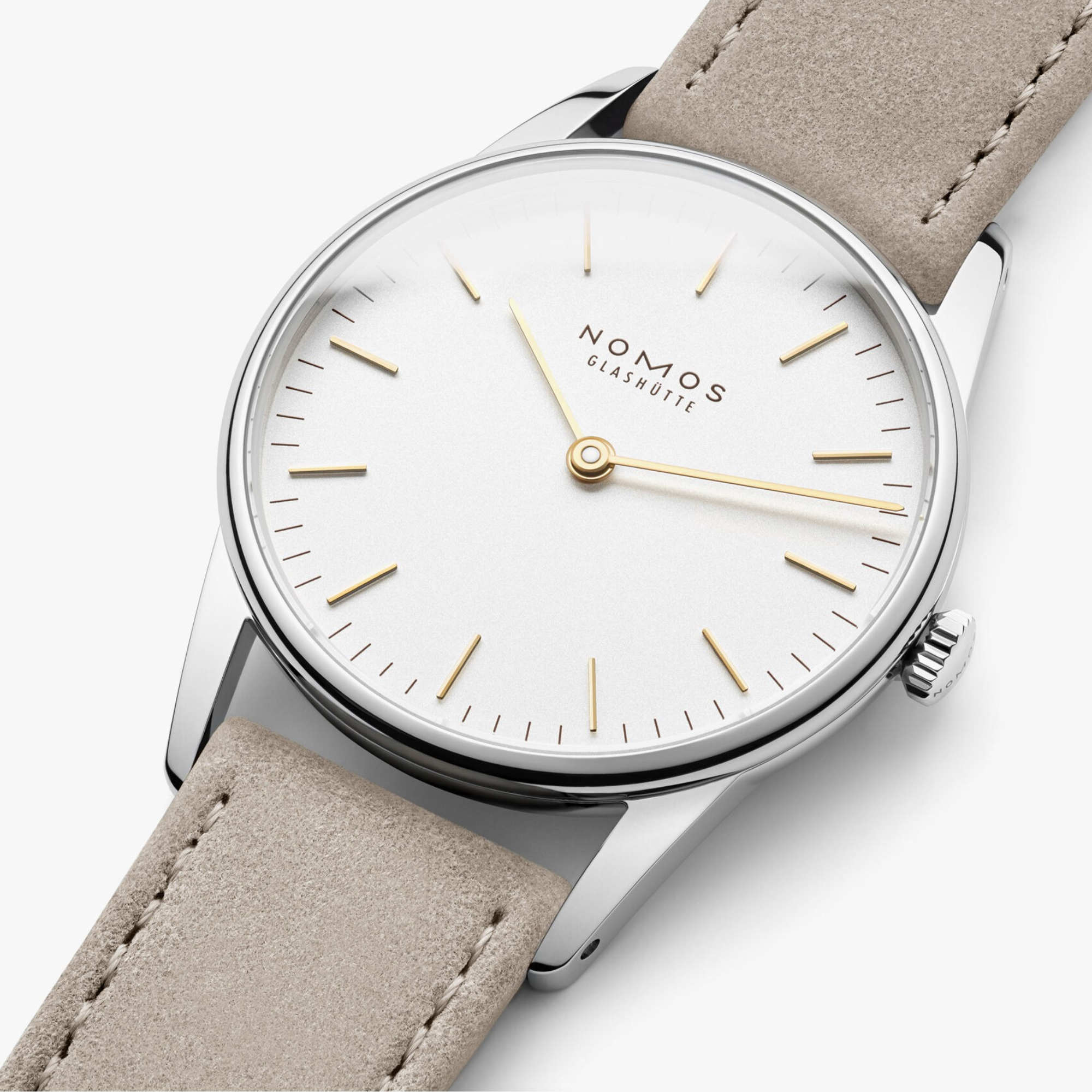 Ref. 320 - Goldene Zeiger und Indizes, ein Gehäuse aus Edelstahl, das Zifferblatt weiß versilbert: Orion 33 Duo passt zu jedem Schmuck – und schmückt mit einem Durchmesser von 33 Millimetern vor allem zartere Handgelenke. Mit ihren zwei goldenen Zeigern ist die Uhr zudem noch reduzierter, aber auch femininer als die NOMOS-Standardmodelle.Ihr Ansprechpartner