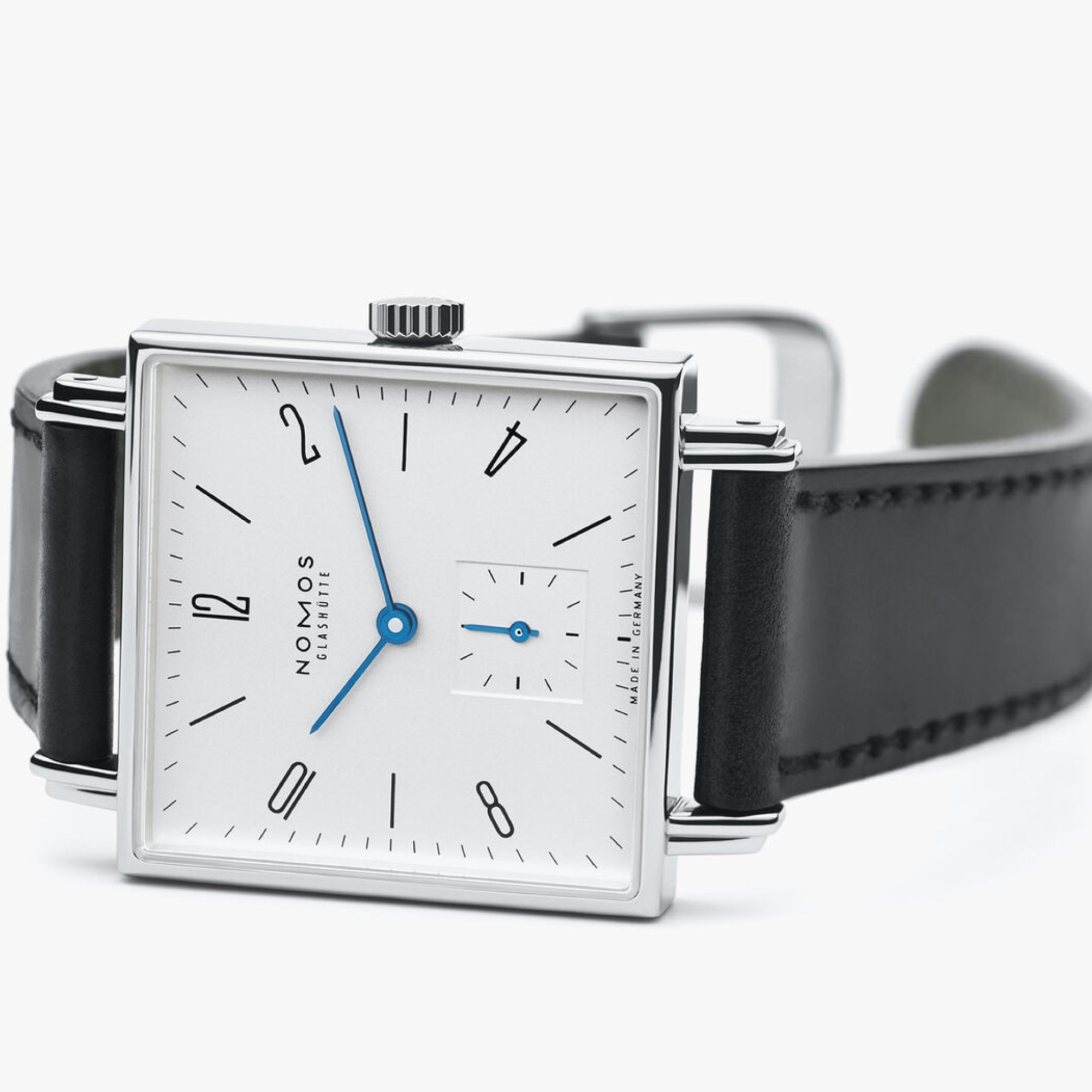 Ref. 408 - Kantiges Äußeres, klassische innere Werte: In Tetra verliebt man sich sofort oder nie – aber wen es einmal erwischt, den lässt diese Uhr nicht mehr los. Weiß versilbertes Zifferblatt, temperaturgebläute Zeiger, kein Firlefanz. Stil zum Quadrat für Menschen mit Charakter.Ihr Ansprechpartner