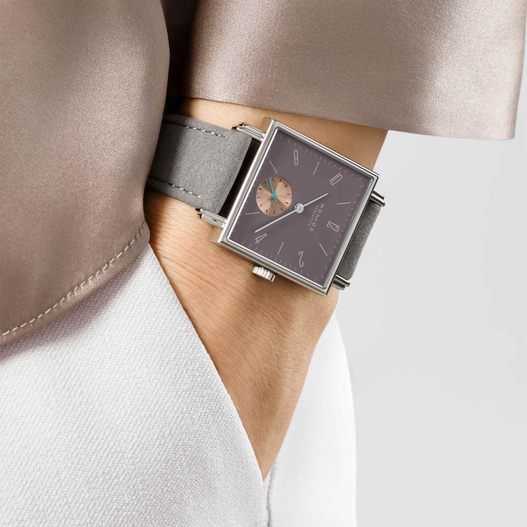 Ref. 475 - In kräftigem Aubergine signalisiert Tetra Selbstbewusstsein. Das luxuriöse Roségold der kleinen Sekunde fügt etwas Genießerisches hinzu, der türkis lackierte Sekundenzeiger zeigt Sinn für Humor. Am samtgrauen Band aus veganem Velours liegt die Handaufzugsuhr mit dem manufakturgefertigten Alpha-Kaliber weich am Arm. Wertvoll und präzise – einzigartige Uhrmacherkunst aus GlashütteIhr Ansprechpartner