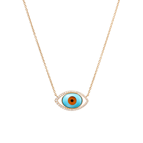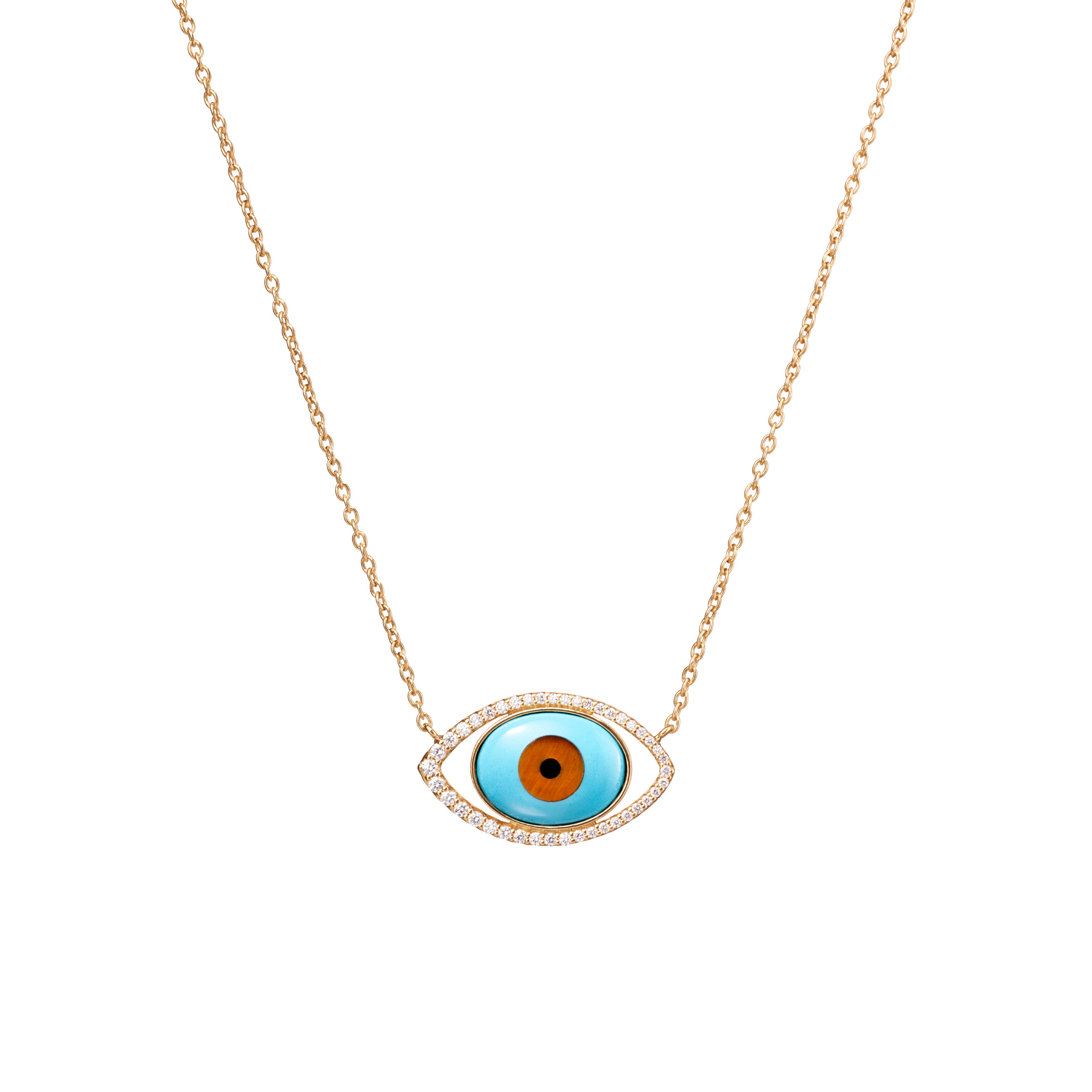 Ref. A3258-402 - Dieses von Charlotte Lynggaard entworfene Collier ist mit einem Evil Eye verziert. Der Evil Eye ist aus Tigerauge, Türkis und Onyx gefertigt und von 42 Diamanten mit insgesamt 0,25 Karat umgeben. TW/VS. Die Kette, Anker 30, ist aus 18k Gelbgold gefertigt. Es misst insgesamt 60 cm und verfügt über Ösen, sodass es bei 45, 50 oder 60 cm getragen werden kann. Das verstellbare Ende des Colliers ist mit einer zierlichen Sternschnuppe verziert, die aus 6 Diamanten mit insgesamt 0,03 Karat besteht. TW VS, für einen besonders eleganten Glanz. Von Goldschmiedemeistern in Handarbeit gefertigt. Teil der Shooting Stars-Kollektion.