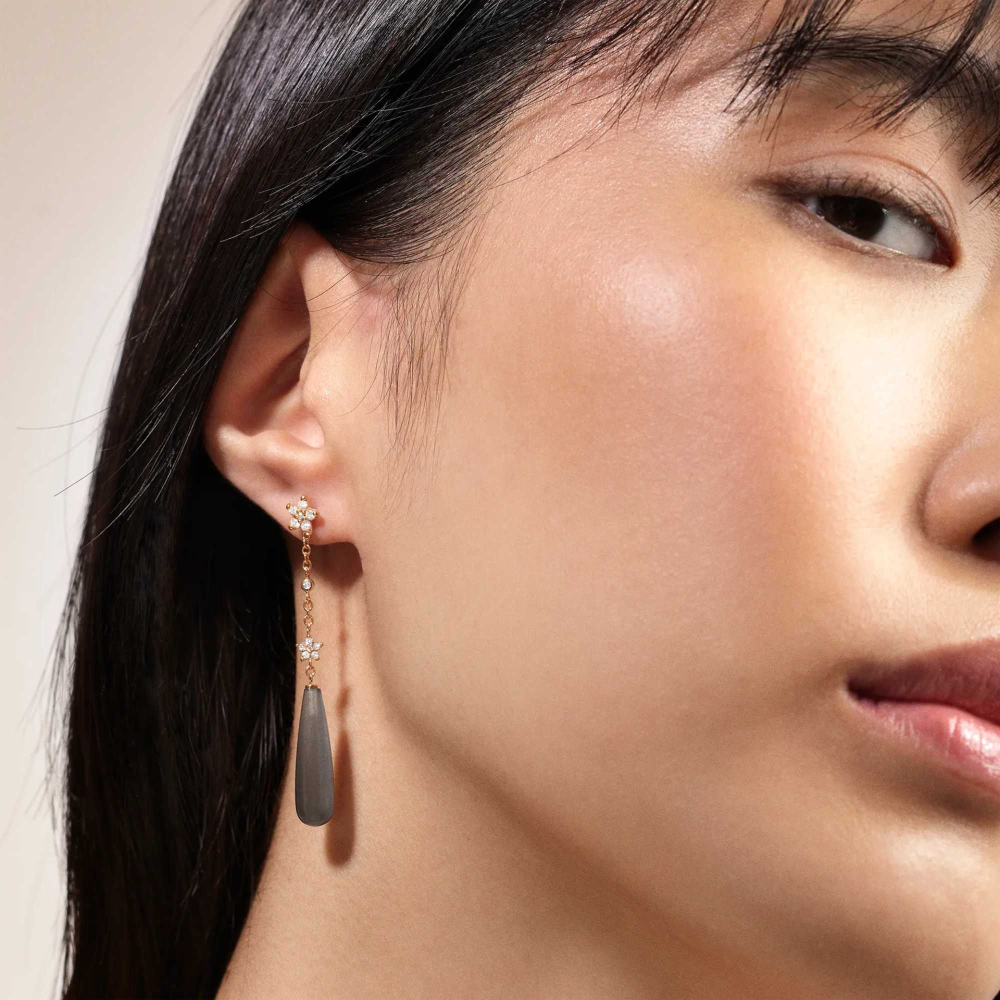 Ref. A2862-410 - Der von Charlotte Lynggaard entworfene Shooting Stars Ohrring-Einhänger ist aus 18 Karat Gelbgold und 14 Diamanten von insgesamt 0,12 carat TW. VS. gefertigt. Der facettierte, graue Mondsteintropfen misst 22x6 und die Gesamtlänge des Anhängers beträgt 5,2 cm. Handgefertigt von Goldschmiedemeistern. Wird als Paar verkauft. Bitte beachten Sie: Da Edelsteine natürliche Materialien sind, ist jeder Stein ein absolutes Unikat. Sie variieren in der Farbe und haben individuelle, einzigartige Einschlüsse und Merkmale. Web-Bilder von Steinen sind nur Repräsentanten des einzigartigen Steins, den Sie erhalten, wenn Sie das Produkt bestellen, nicht der exakte Stein.Ihr Ansprechpartner