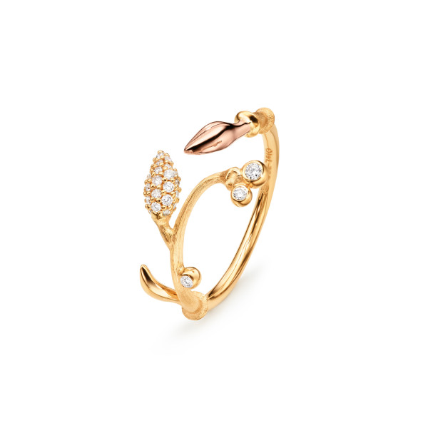 Ref. A2883-401 - Der von Charlotte Lynggaard entworfene Blooming ring ist aus von Hand satiniertem 18-karätiges Gelb- und Roségold mit drei Diamanten in Zargenfassung und 25 Diamanten in Pavé-Fassung von insgesamt 0,12 carat TW. VS. gefertigt. Handgefertigt von Goldschmiedemeistern. Teil der Blooming Collection.Ihr Ansprechpartner