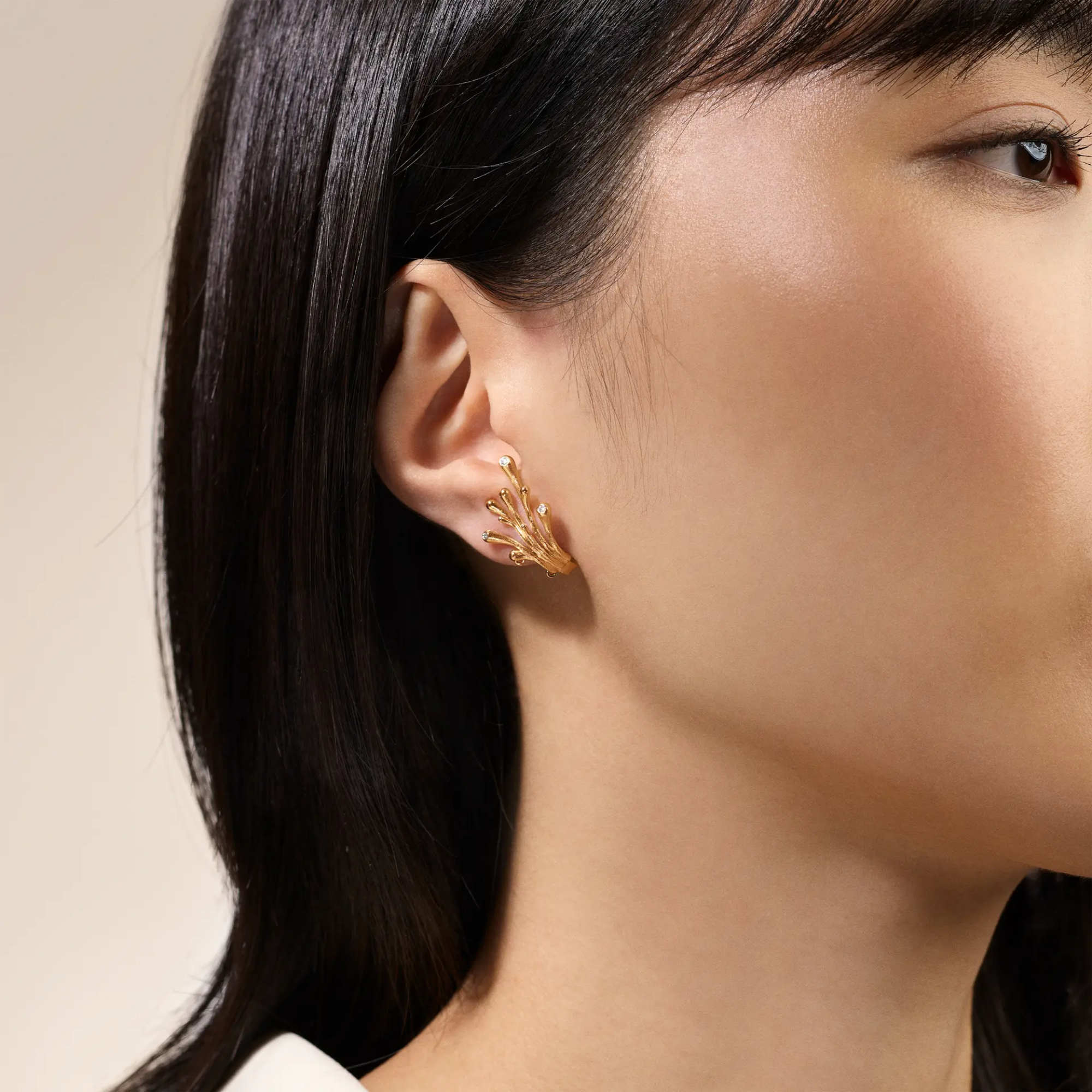 Ref. A2934-402 - Die von Charlotte Lynggaard entworfenen BoHo Zweig Ohrclips Klein sind aus 750/- Gelbgold handgearbeitet, verziert mit 6 Diamanten 0,06 carat TW. VS. Jeder Ohrclip hat zwei Ösen zum Einhängen von Anhängern. Die gehämmerten und polierten Goldoberflächen werden von Goldschmiedemeistern von Hand veredelt. Als Paar zu erwerben. Teil der BoHo Collection.