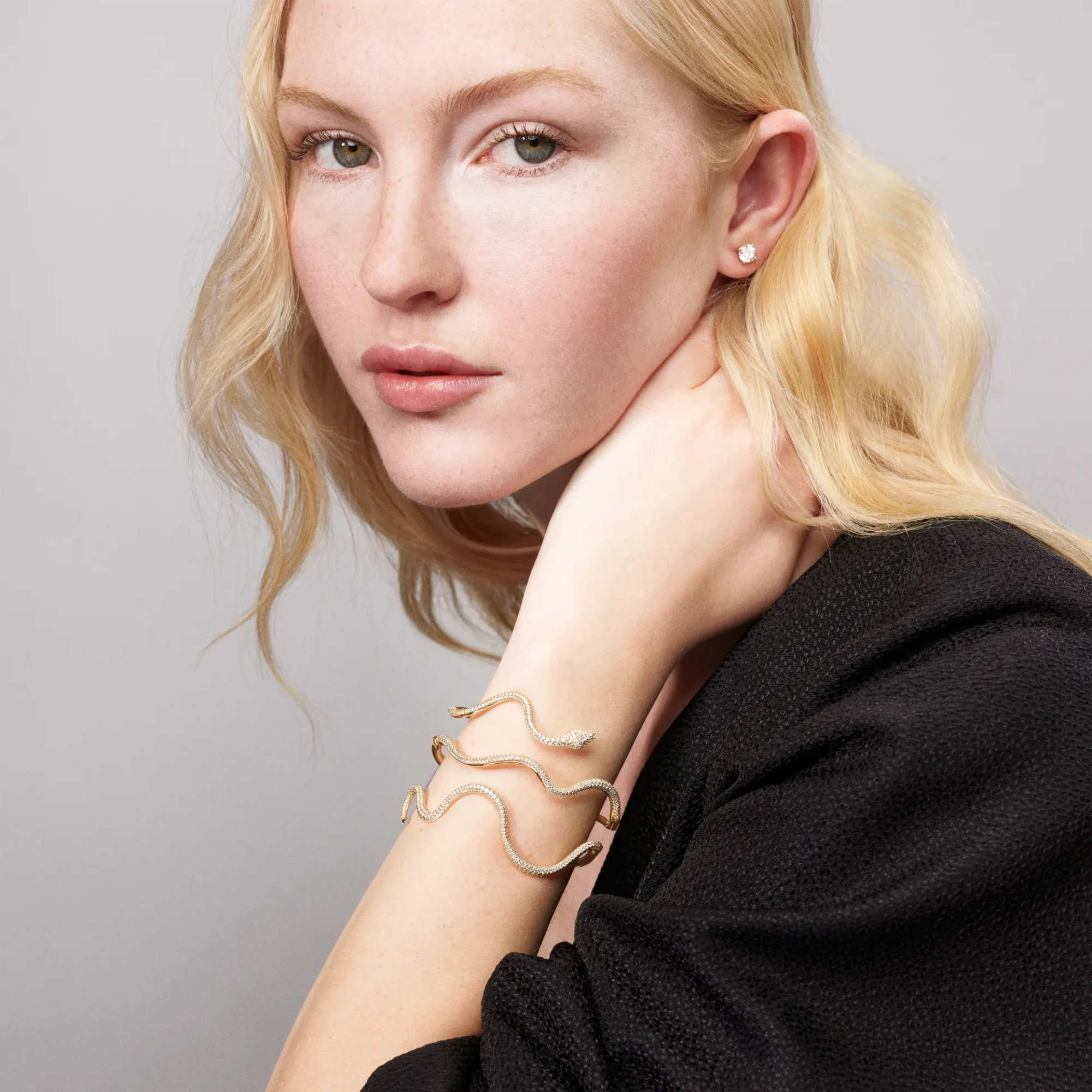 Ref. A3140-401 - Dieser Snakes-Armreif ist aus 18-karätigem Gelbgold gefertigt und mit 691 Diamanten in Pavé-Fassung von insgesamt 4 ct. besetzt. TW. VS. Die Innenseite des Armreifs hat eine polierte Oberfläche. Der Armreif wurde von Charlotte Lynggaard anlässlich des 60-jährigen Bestehens von OLE LYNGGAARD COPENHAGEN im Jahr 2023 entworfen. Teil der von Ole Lynggaard entworfenen Snakes-Kollektion.Ihr Ansprechpartner