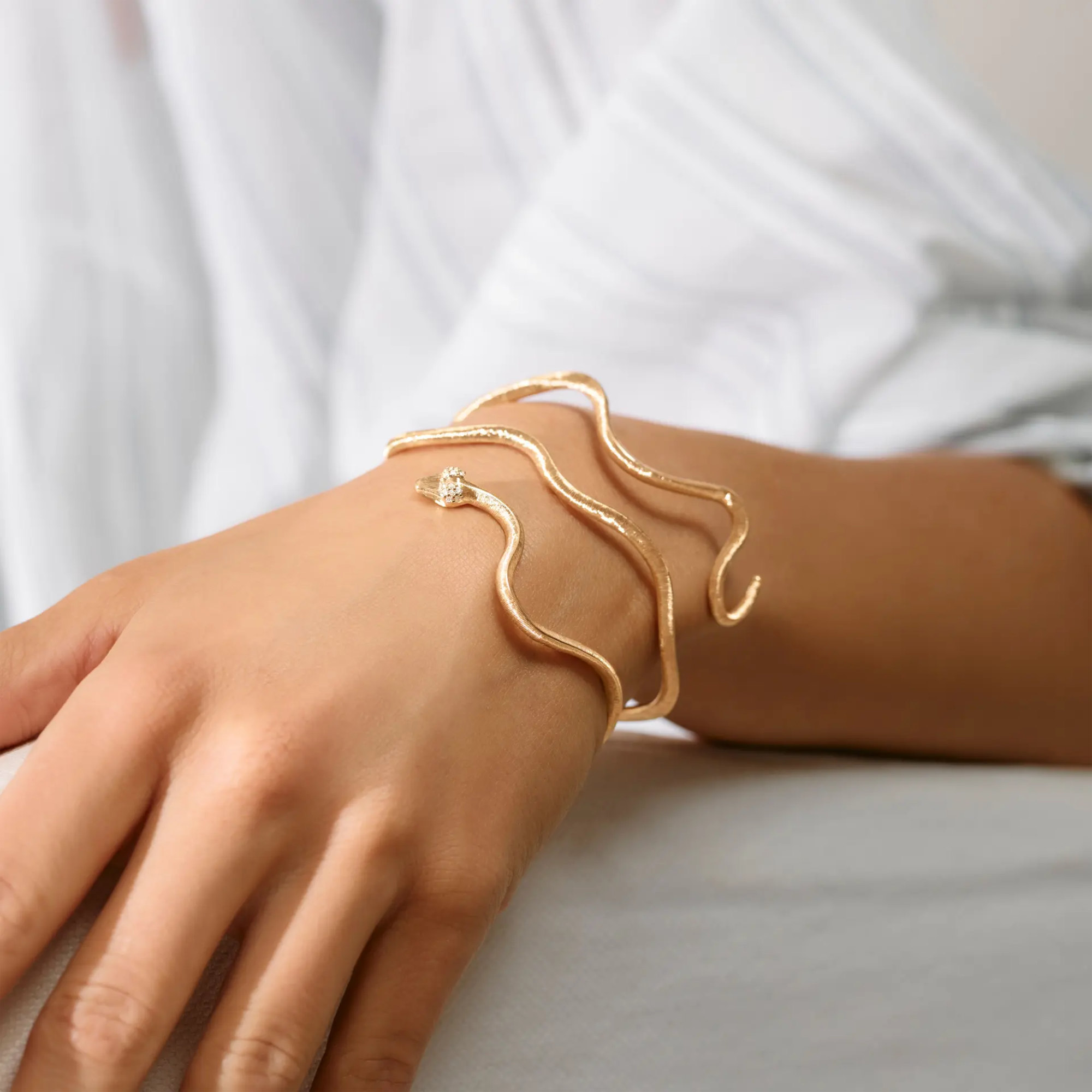 Ref. A3140-405 - Dieser Snakes-Armreif ist aus 750/- Gelbgold gefertigt und mit 14 Diamanten von insgesamt 0.08 Karat tw/vs besetzt. Das Design besticht durch seine skulpturale Silhouette und seine spielerisch geschwungenen, weichen Kurven. Die Goldoberfläche wird sorgfältig von Hand satiniert. Dadurch entsteht ein einzigartiges Finish, das von herausragender Handwerkskunst zeugt. Die Innenseite des Armreifs hat eine poliertes Finish. Die Snakes-Kollektion wurde von Ole Lynggaard ins Leben gerufen. Dieses Stück wurde von Charlotte Lynggaard entworfen. Teil der Snakes-Kollektion.