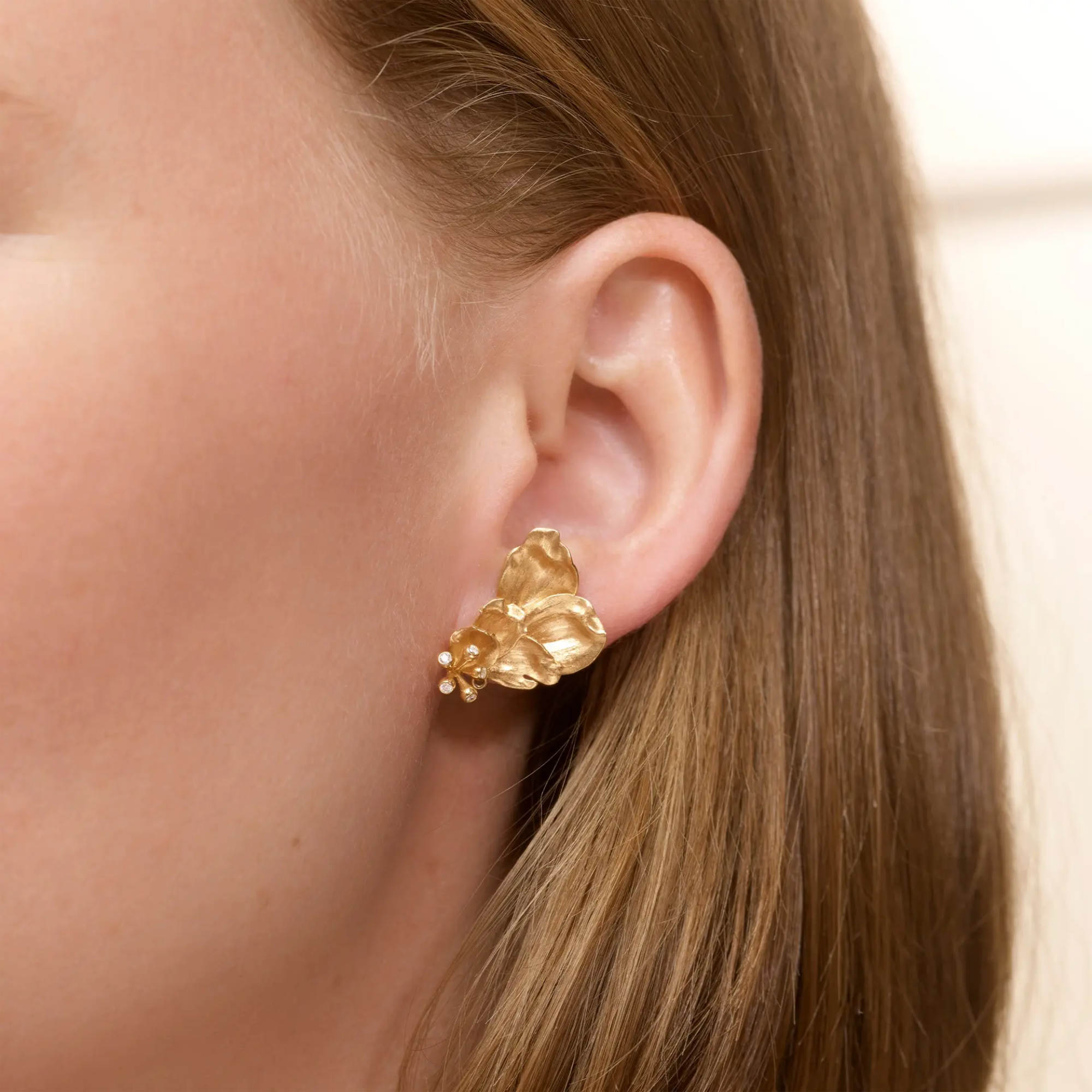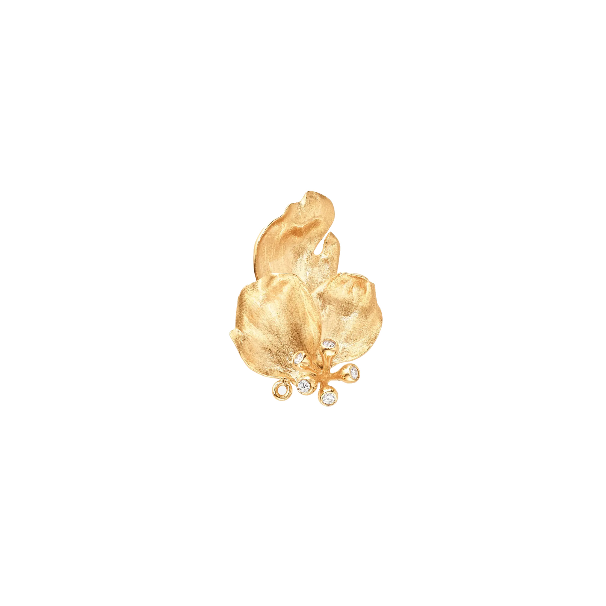 Ref. A3191-403 - Dieser von Charlotte Lynggaard entworfenen Wild Rose-Ohrstecker ist aus 750/- Gelbgold. gefertigt und mit 5 Diamanten von insgesamt 0,05 Karat tw/vs besetzt. Goldschmiedemeister ritzen und hämmern das Gold von Hand und polieren die Kanten, um die Zartheit jedes Blumenwunders hervorzuheben. Der Ohrring hat eine kleine Öse auf der Rückseite, um austauschbare Anhänger oder Tropfen anzuhängen. Als Einzelstück verkauft. Teil der Wild Rose-Kollektion.