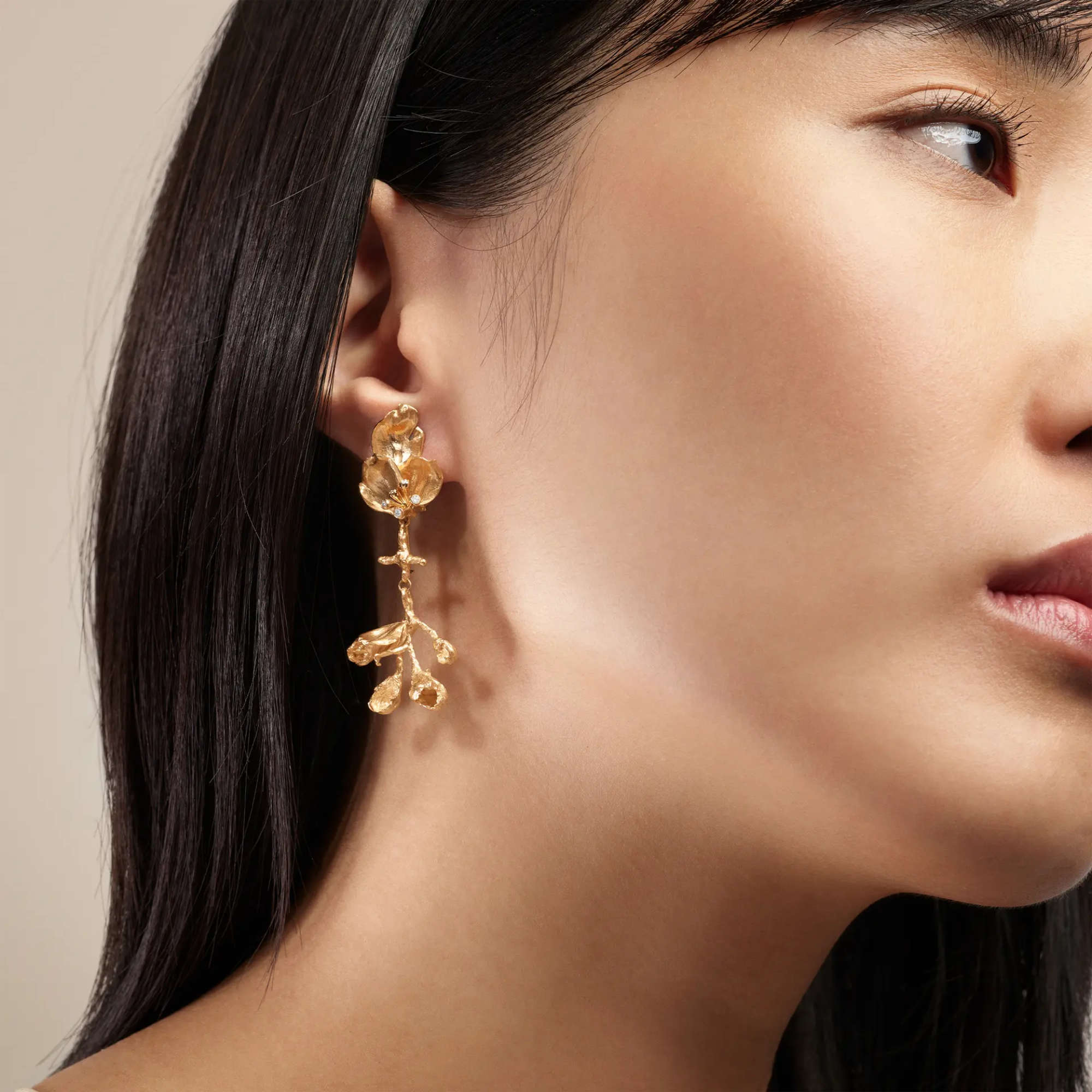 Ref. A3192-401 - Diese von Charlotte Lynggaard entworfenen Wild Rose-Ohrringanhänger sind aus 18-karätigem Gelbgold gefertigt. Goldschmiedemeister ritzen und hämmern die Goldoberflächen von Hand, um jedes Blumenwunder mit Leben zu erfüllen. Die Kanten sind poliert, um ihnen eine glatte Oberfläche zu verleihen. Diese Wild Rose-Ohrringe lassen sich mühelos mit anderen Stücken der Kollektion kombinieren, sodass sich ein Bouquet einzigartiger Ausdrucksformen eröffnet. Jeder Anhänger ist mit einem kleinen Haken versehen, mit dem er leicht an unterschiedlichen Ohrringen befestigt und wieder abgenommen werden kann. Als Paar verkauft. Teil der Wild Rose-Kollektion.Ihr Ansprechpartner