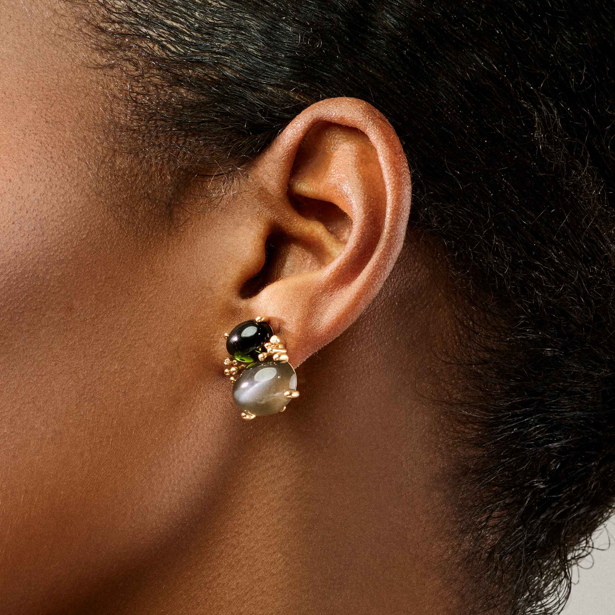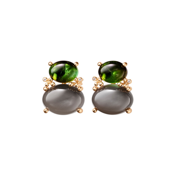 Ref. A3223-403 - Diese von Charlotte Lynggaard entworfenen BoHo-Ohrstecker sind aus 18-karätigem Gelbgold gefertigt und mit zwei grünen Turmalinen, zwei grauen Mondsteinen und mit vier Diamanten von insgesamt 0,01 Karat tw/vs besetzt. Jeder Ohrring hat einen kleinen Haken für Ohrring-Anhänger. Bitte beachten Sie: Da Edelsteine natürliche Materialien sind, ist jeder Stein absolut einzigartig. Die Steine variieren in der Farbe und haben individuelle, einzigartige Einschlüsse und Merkmale. Die auf der Website abgebildeten Steine sind nur repräsentativ. Der einzigartige Edelstein, den Sie nach der Bestellung des Produkts erhalten, ist nicht exakt derselbe Stein, den Sie hier sehen. Als Paar verkauft. Teil der BoHo-Kollektion.Ihr Ansprechpartner