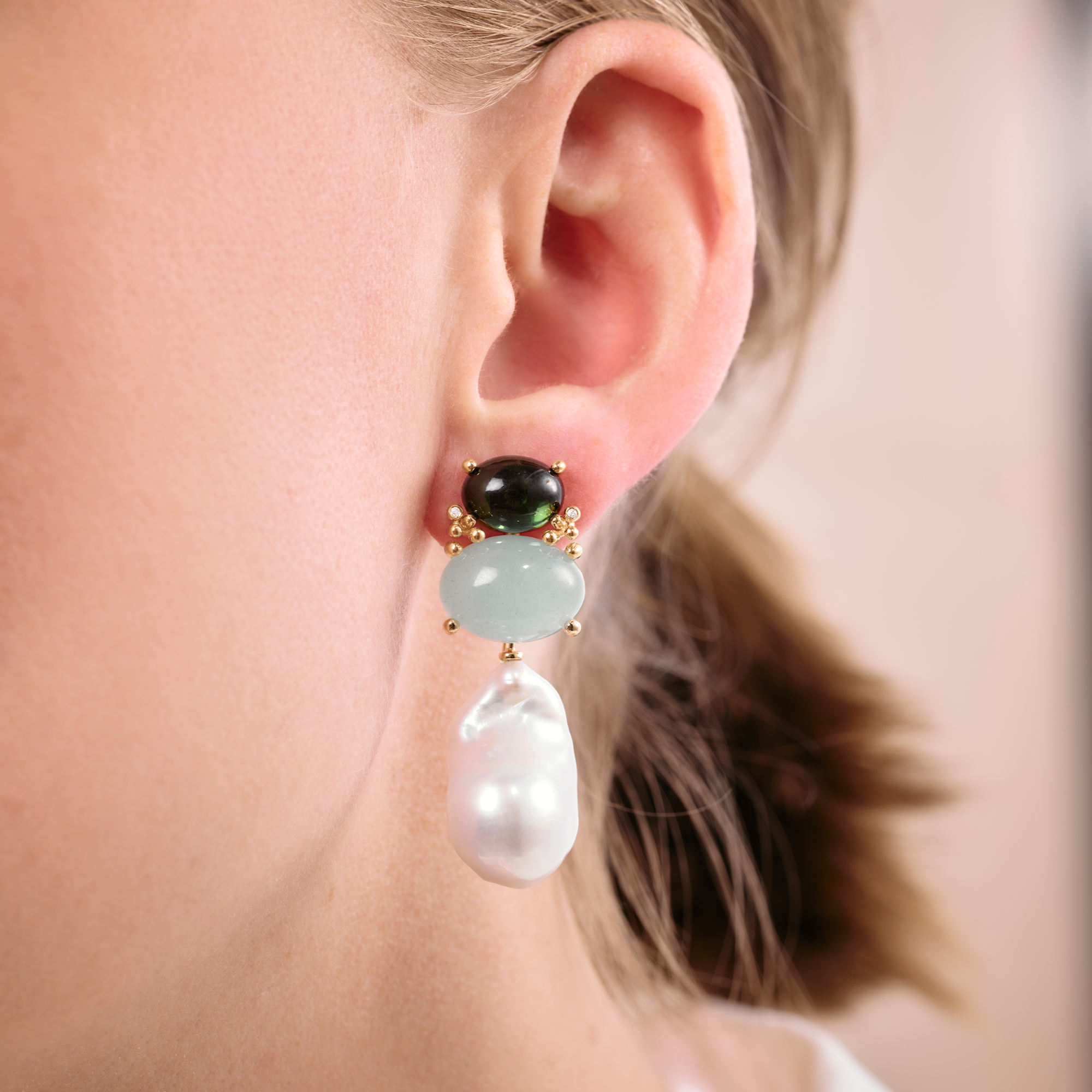 Ref. A3223-405 - Diese von Charlotte Lynggaard entworfenen BoHo-Ohrstecker sind aus 18-karätigem Gelbgold gefertigt und mit zwei grünen Turmalinen, zwei Aquamarinen und vier Diamanten von insgesamt 0,01 Karat tw/vs besetzt. Jeder Ohrring hat einen kleinen Haken für Ohrring-Anhänger. Bitte beachten Sie: Da Edelsteine natürliche Materialien sind, ist jeder Stein absolut einzigartig. Die Steine variieren in der Farbe und haben individuelle, einzigartige Einschlüsse und Merkmale. Die auf der Website abgebildeten Steine sind nur repräsentativ. Der einzigartige Edelstein, den Sie nach der Bestellung des Produkts erhalten, ist nicht exakt derselbe Stein, den Sie hier sehen. Als Paar verkauft. Teil der BoHo-Kollektion.Ihr Ansprechpartner
