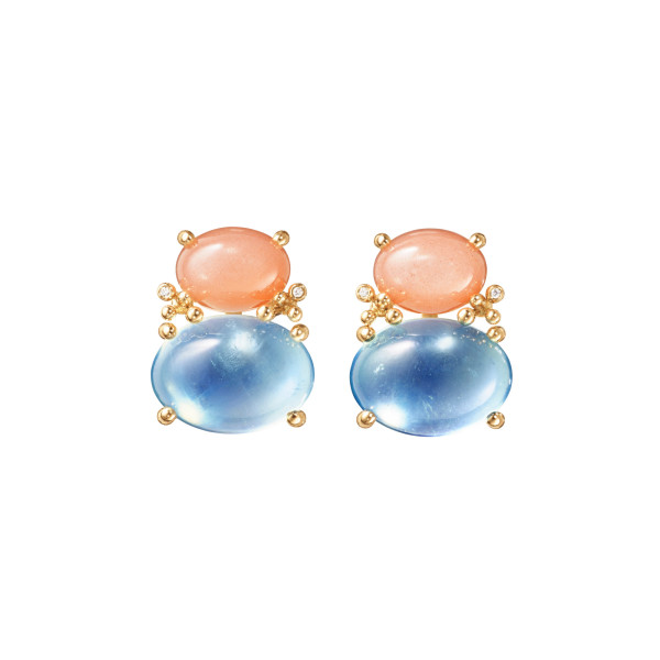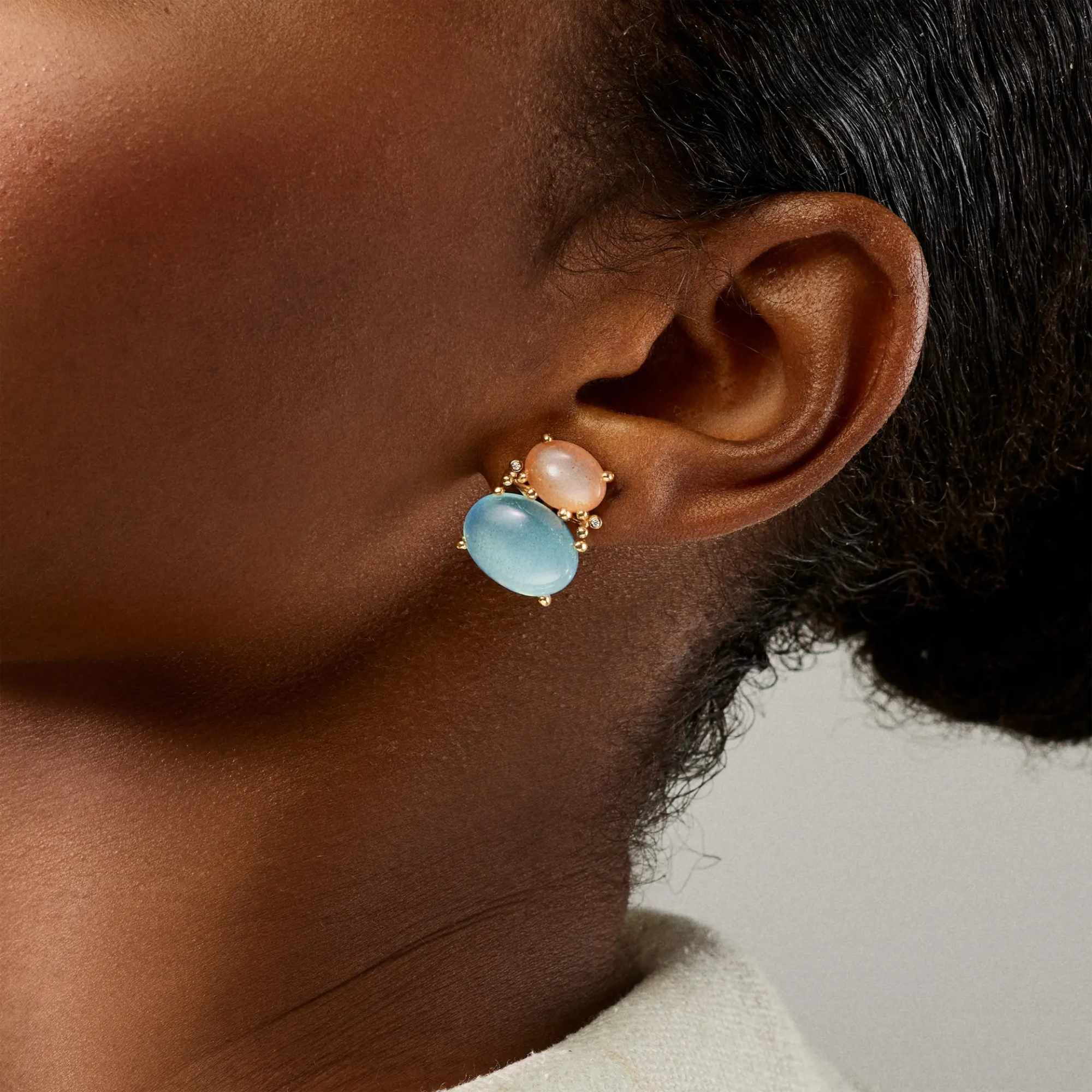 Ref. A3223-407 - Diese von Charlotte Lynggaard entworfenen BoHo-Ohrringe sind aus 18-karätigem Gelbgold gefertigt und mit zwei zartrosa Mondsteinen, zwei Aquamarinen und vier Diamanten von insgesamt 0,01 Karat TW/VS. Jeder Ohrring hat einen kleinen Haken für Ohrring-Anhänger. Als Paar verkauft. Teil der BoHo-Kollektion.Ihr Ansprechpartner