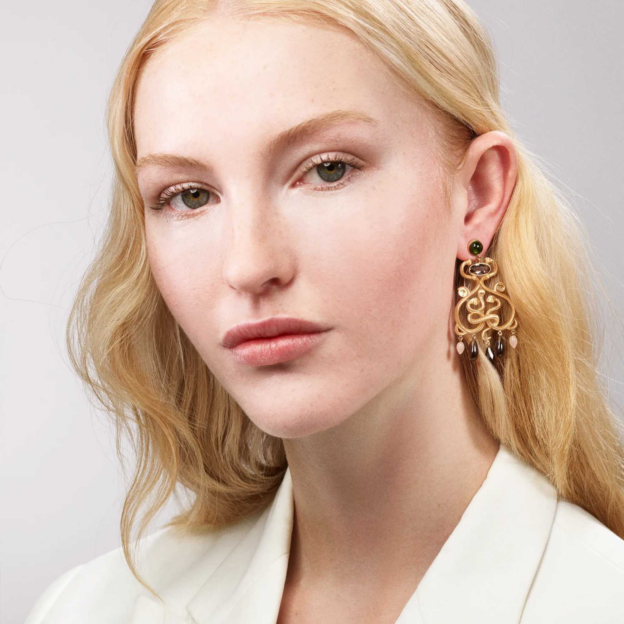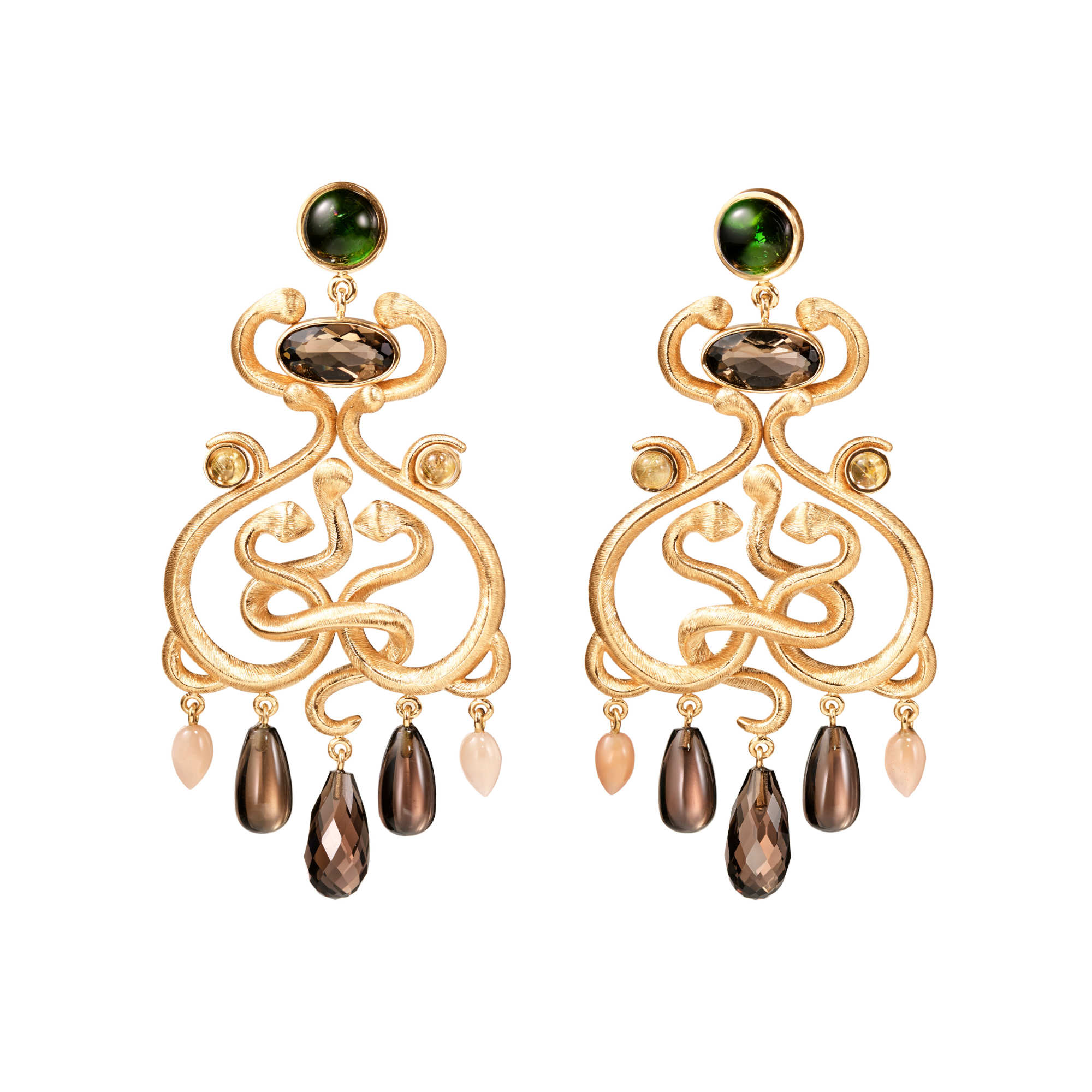 Ref. A3250-401 - Diese von Charlotte Lynggaard entworfenen Snakes-Ohrringe im Chandelier-Stil sind aus 18-karätigem Gelbgold gefertigt. Jeder Ohrring ist mit zwei grünen Turmalin im Cabochon-Schliff, zwei facettierten Rauchquarzen, zwei Rauchquarzen im Cabochon-Schliff, zwei Rutilquarzen im Cabochon-Schliff und zwei zartrosa Mondsteinen besetzt. Wird als Paar verkauft.
