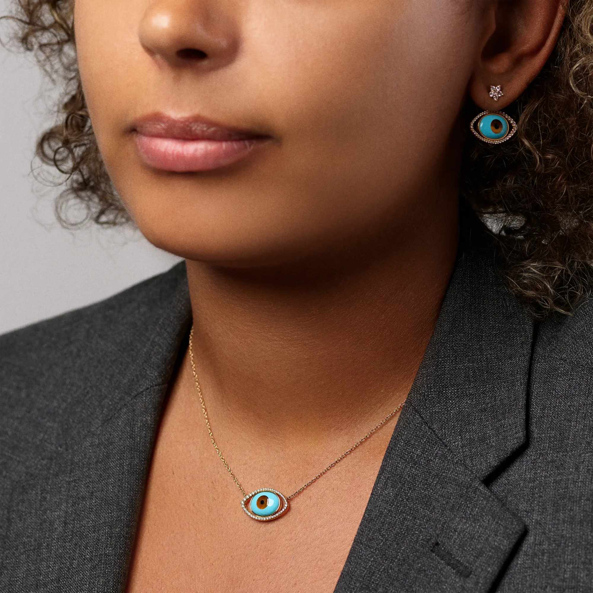 Ref. A3258-401 - Dieses von Charlotte Lynggaard entworfene Collier ist mit einem Evil Eye verziert. Der Evil Eye ist aus Tigerauge, Türkis und Onyx gefertigt und von 42 Diamanten mit insgesamt 0,25 Karat umgeben. TW/VS. Die Kette, Anker 30, ist aus 18k Gelbgold gefertigt. Es misst insgesamt 45 cm und verfügt über Ösen, sodass es bei 40, 42 oder 45 cm getragen werden kann. Das verstellbare Ende des Colliers ist mit einer zierlichen Sternschnuppe verziert, die aus 6 Diamanten mit insgesamt 0,03 Karat besteht. TW VS, für einen besonders eleganten Glanz. Von Goldschmiedemeistern in Handarbeit gefertigt. Teil der Shooting Stars-Kollektion.